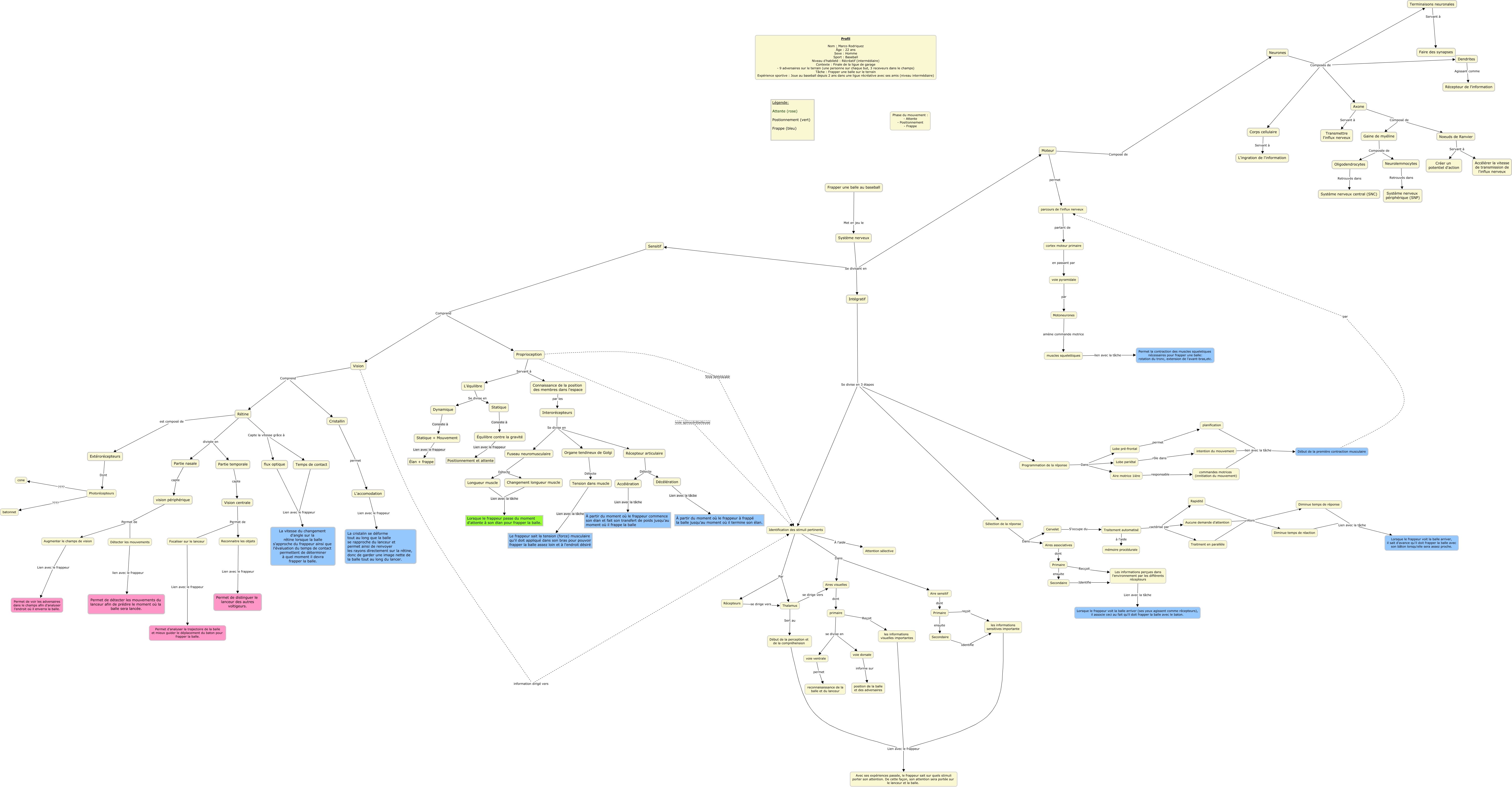 Cette carte de concepts créée avec IHMC CmapTools traite de: Frapper une balle, intention du mouvement lien avec la tâche Début de la première contraction musculaire, Secondaire Identifie les informations sensitives importante, Récepteur articulaire Détecte Accélération, Primaire ensuite Secondaire, Corps cellulaire Servant à L'ingration de l'information, Diminue temps de réponse Lien avec la tâche Lorsque le frappeur voit la balle arriver, il sait d'avance qu'il doit frapper la balle avec son bâton lorsqu'elle sera assez proche., Axone Servant à Transmettre l'influx nerveux, Vision Comprend Rétine, Identification des stimuli pertinents Dans Aire sensitif, Axone Composé de Gaine de myéline, Aire motrice 1ière responsable commandes motrices (innitiation du mouvement), Moteur Composé de Neurones, Traitement automatisé cactérisé par Traitment en parallèle, Programmation de la réponse Dans Lobe pré-frontal, Motoneurones amène commande motrice muscles squelettiques, Aucune demande d'attention Alors Diminue temps de réaction, Terminaisons neuronales Servant à Faire des synapses, Intégratif Se divise en 3 étapes Identification des stimuli pertinents, Aires visuelles dont primaire, Statique + Mouvement Lien avec le frappeur Élan + frappe