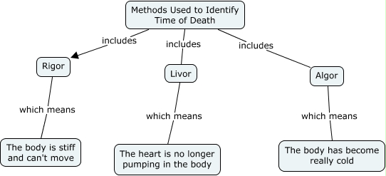 This Concept Map, created with IHMC CmapTools, has information related to: CMap 1, Methods Used to Identify Time of Death includes Rigor, Algor which means The body has become really cold, Livor which means The heart is no longer pumping in the body, Rigor which means The body is stiff and can't move, Methods Used to Identify Time of Death includes Algor, Methods Used to Identify Time of Death includes Livor