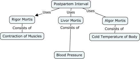 This Concept Map, created with IHMC CmapTools, has information related to: Method of TIme of Death, Livor Mortis Consists of Blood Pressure, Algor Mortis Consists of Cold Temperature of Body, Postpartem Interval Uses Rigor Mortis, Rigor Mortis Consists of Contraction of Muscles, Postpartem Interval Uses Livor Mortis, Postpartem Interval Uses Algor Mortis