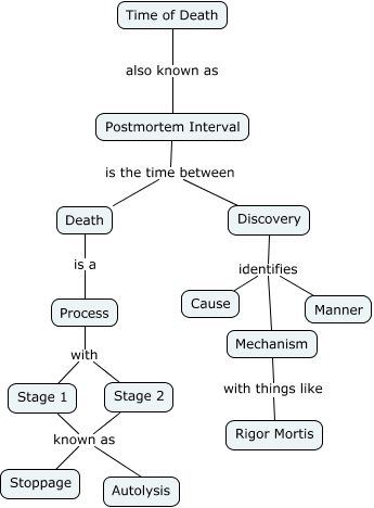 This Concept Map, created with IHMC CmapTools, has information related to: Methods to Determine Time of Death, Postmortem Interval is the time between Discovery, Time of Death also known as Postmortem Interval, Mechanism with things like Rigor Mortis, Stage 1 known as Stoppage, Process with Stage 1, Stage 1 known as Autolysis, Discovery identifies Mechanism, Stage 2 known as Autolysis, Death is a Process, Postmortem Interval is the time between Death, Process with Stage 2, Discovery identifies Manner, Discovery identifies Cause, Stage 2 known as Stoppage
