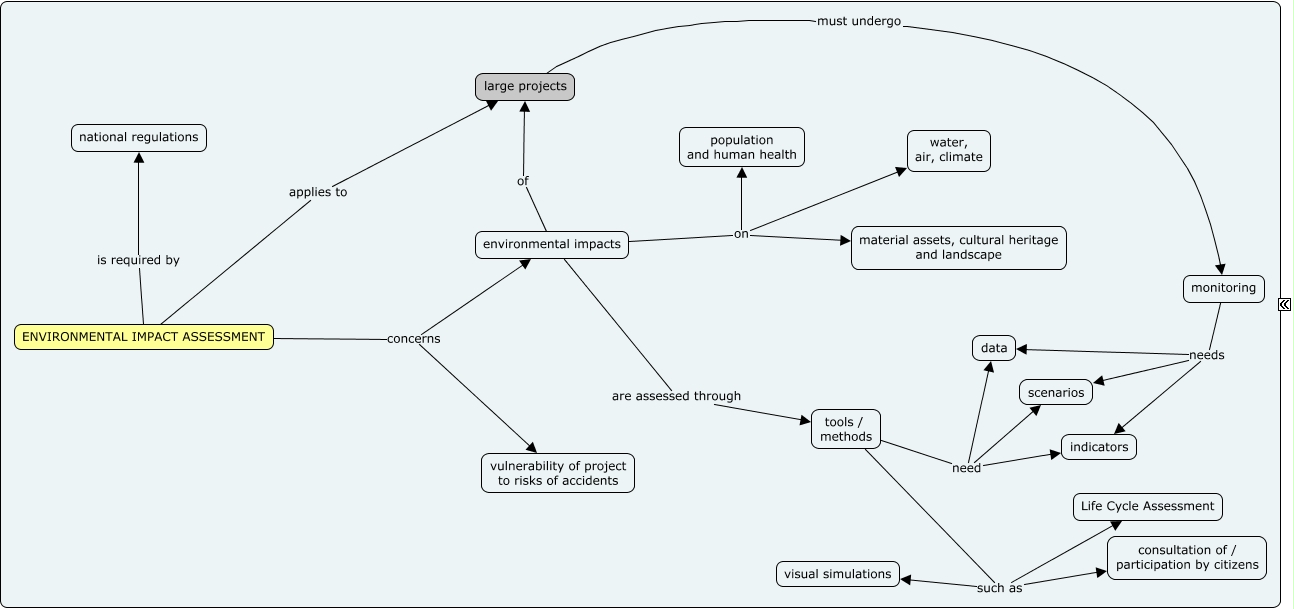 Questa Cmap, creata con IHMC CmapTools, contiene informazioni relative a: EIA, environmental impacts on material assets, cultural heritage and landscape, tools / methods need scenarios, environmental impacts are assessed through tools / methods, ENVIRONMENTAL IMPACT ASSESSMENT concerns environmental impacts, ENVIRONMENTAL IMPACT ASSESSMENT is required by national regulations, tools / methods such as Life Cycle Assessment, monitoring needs data, ENVIRONMENTAL IMPACT ASSESSMENT applies to large projects, environmental impacts on water, air, climate, monitoring needs indicators, environmental impacts on population and human health, tools / methods such as consultation of / participation by citizens, large projects must undergo monitoring, tools / methods such as visual simulations, ENVIRONMENTAL IMPACT ASSESSMENT concerns vulnerability of project to risks of accidents, tools / methods need data, environmental impacts of large projects, monitoring needs scenarios, tools / methods need indicators