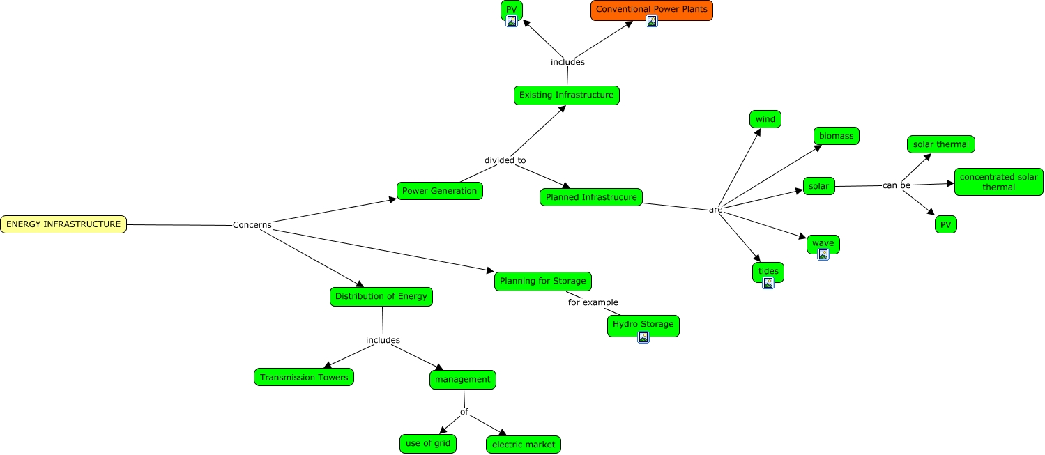 Questa Cmap, creata con IHMC CmapTools, contiene informazioni relative a: Energy Infrastructure, Planned Infrastrucure are wave, management of electric market, Planned Infrastrucure are wind, management of use of grid, Existing Infrastructure includes Conventional Power Plants, solar can be concentrated solar thermal, Planned Infrastrucure are solar, ENERGY INFRASTRUCTURE Concerns Planning for Storage, Power Generation divided to Existing Infrastructure, ENERGY INFRASTRUCTURE Concerns Power Generation, Planned Infrastrucure are tides, Existing Infrastructure includes PV, solar can be PV, Distribution of Energy includes management, ENERGY INFRASTRUCTURE Concerns Distribution of Energy, solar can be solar thermal, Planning for Storage for example Hydro Storage, Planned Infrastrucure are biomass, Power Generation divided to Planned Infrastrucure, Distribution of Energy includes Transmission Towers