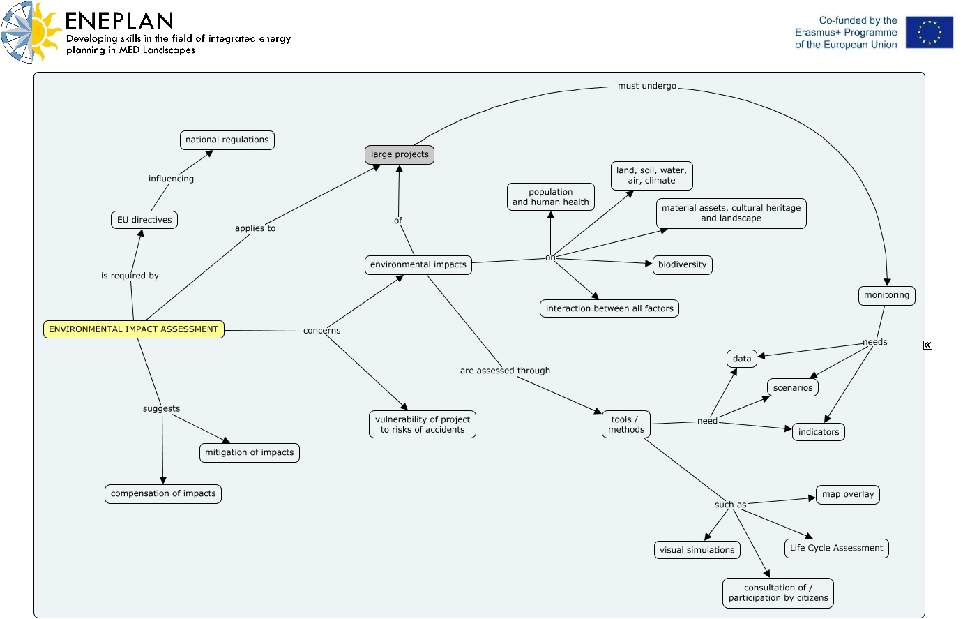 Questa Cmap, creata con IHMC CmapTools, contiene informazioni relative a: EIA, environmental impacts of large projects, environmental impacts on biodiversity, environmental impacts on land, soil, water, air, climate, ENVIRONMENTAL IMPACT ASSESSMENT suggests compensation of impacts, environmental impacts on interaction between all factors, ENVIRONMENTAL IMPACT ASSESSMENT concerns environmental impacts, tools / methods such as consultation of / participation by citizens, environmental impacts on material assets, cultural heritage and landscape, monitoring needs data, tools / methods such as Life Cycle Assessment, tools / methods such as visual simulations, monitoring needs indicators, large projects must undergo monitoring, tools / methods need data, EU directives influencing national regulations, tools / methods need indicators, environmental impacts on population and human health, tools / methods need scenarios, ENVIRONMENTAL IMPACT ASSESSMENT concerns vulnerability of project to risks of accidents, tools / methods such as map overlay