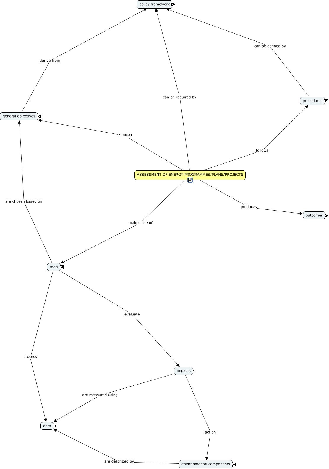 Questa Cmap, creata con IHMC CmapTools, contiene informazioni relative a: Assessment, TOOLS are visual simulations, ASSESSMENT OF ENERGY PROGRAMMES/PLANS/PROJECTS produces outcomes, OUTCOMES comprise decision, POLICY FRAMEWORK includes international legislation, tools process data, POLICY FRAMEWORK includes national legislation, GENERAL OBJECTIVES include financial sustainability, IMPACTS can be grouped as pollution, GENERAL OBJECTIVES include energy security, provisions concern compensation of impacts, POLICY FRAMEWORK includes international agreements/strategies, impacts are measured using data, ENVIRONMENTAL COMPONENTS are flora and fauna biodiversity, TOOLS are definition of scenarios, POLICY FRAMEWORK includes subnational legislation, DATA concern context, OUTCOMES comprise provisions, tools evaluate impacts, GENERAL OBJECTIVES include social sustainability, ENVIRONMENTAL COMPONENTS are land, soil, water, air, climate