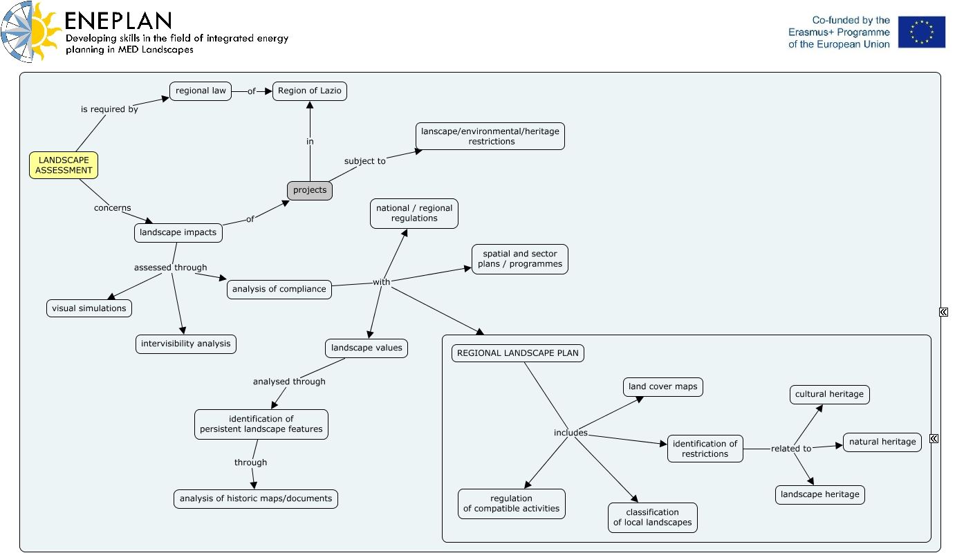 Questa Cmap, creata con IHMC CmapTools, contiene informazioni relative a: Landscape assessment, identification of restrictions related to landscape heritage, analysis of compliance with landscape values, REGIONAL LANDSCAPE PLAN includes identification of restrictions, REGIONAL LANDSCAPE PLAN includes regulation of compatible activities, LANDSCAPE ASSESSMENT concerns landscape impacts, projects subject to lanscape/environmental/heritage restrictions, landscape impacts assessed through intervisibility analysis, analysis of compliance with spatial and sector plans / programmes, REGIONAL LANDSCAPE PLAN includes land cover maps, analysis of compliance with Regional Landscape Plan, identification of persistent landscape features through analysis of historic maps/documents, landscape impacts of projects, landscape impacts assessed through visual simulations, landscape values analysed through identification of persistent landscape features, identification of restrictions related to natural heritage, regional law of Region of Lazio, landscape impacts assessed through analysis of compliance, identification of restrictions related to cultural heritage, REGIONAL LANDSCAPE PLAN includes classification of local landscapes, projects in Region of Lazio