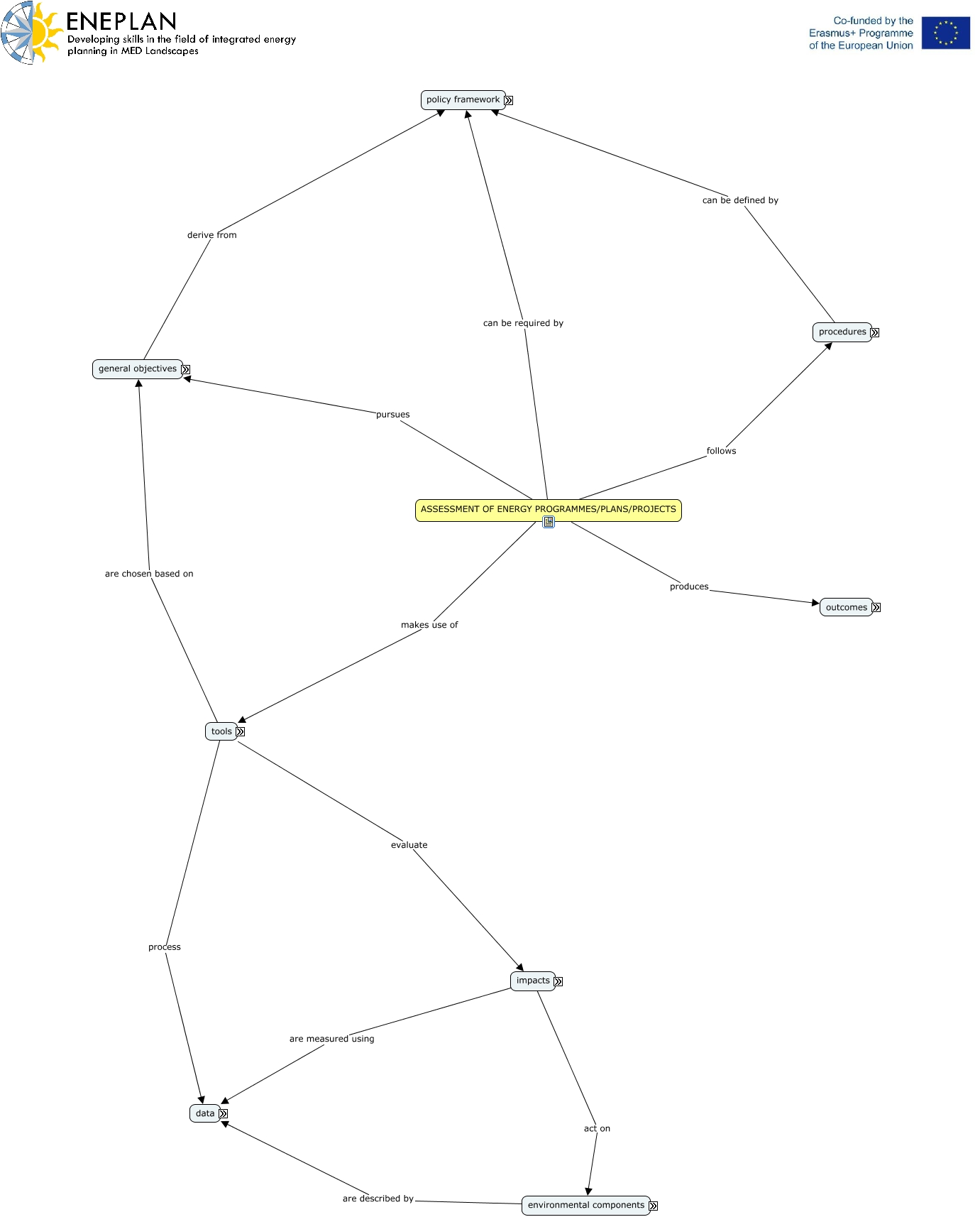 Questa Cmap, creata con IHMC CmapTools, contiene informazioni relative a: Assessment, TOOLS are visual simulations, ASSESSMENT OF ENERGY PROGRAMMES/PLANS/PROJECTS produces outcomes, OUTCOMES comprise decision, POLICY FRAMEWORK includes international legislation, tools process data, POLICY FRAMEWORK includes national legislation, GENERAL OBJECTIVES include financial sustainability, IMPACTS can be grouped as pollution, GENERAL OBJECTIVES include energy security, provisions concern compensation of impacts, POLICY FRAMEWORK includes international agreements/strategies, impacts are measured using data, ENVIRONMENTAL COMPONENTS are flora and fauna biodiversity, TOOLS are definition of scenarios, POLICY FRAMEWORK includes subnational legislation, DATA concern context, OUTCOMES comprise provisions, tools evaluate impacts, GENERAL OBJECTIVES include social sustainability, ENVIRONMENTAL COMPONENTS are land, soil, water, air, climate