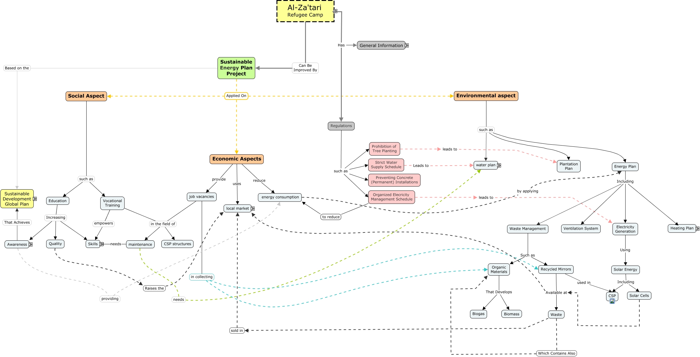 Questa Cmap, creata con IHMC CmapTools, contiene informazioni relative a: Al-Za'tari Refugee Camp.cmap, Solar Cells Available at Waste, Vocational Training in the field of CSP structures, Regulations such as Preventing Concrete (Permanent) Installations, Environmental aspect such as Plantation Plan, Awareness That Achieves Sustainable Development Global Plan, Organic Materials That Develops Biomass, local materials which are available, Vocational Training empowers Skills, Vocational Training in the field of maintenance, Waste Which Contains Also Organic Materials, Prohibition of Tree Planting leads to Plantation Plan, Social Aspect such as Education, Awareness providing energy consumption, Solar Energy Including CSP, Education Increasing Quality, Economic Aspects uses local market, Electricity Generation Using Solar Energy, Strict Water Supply Schedule Leads to water plan, maintenance needs Skills, Al-Za'tari Refugee Camp Has Regulations