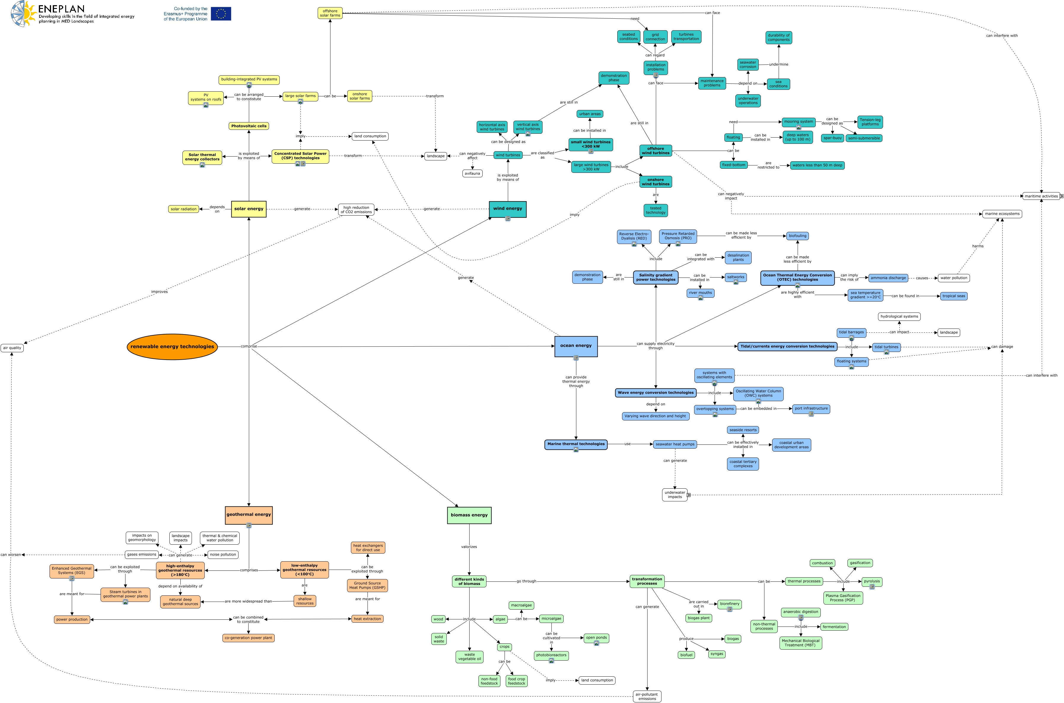 Questa Cmap, creata con IHMC CmapTools, contiene informazioni relative a: RES technologies, crops can be food crop feedstock, ocean energy can provide thermal energy through Marine thermal technologies, offshore wind turbines can negatively impact maritime activities, heat extraction can be combined to constitute co-generation power plant, seawater heat pumps can generate underwater impacts, small wind turbines kW can be installed in urban areas, non-thermal processes include anaerobic digestion, transformation processes are carried out in biogas plant, high-enthalpy geothermal resources (°C) depend on availability of natural deep geothermal sources, Wave energy conversion technologies include overtopping systems, offshore solar farms need grid connection, underwater impacts can damage marine ecosystems, microalgae can be cultivated in photobioreactors, renewable energy technologies comprise ocean energy, mooring system can be designed as spar-buoy, different kinds of biomass include solid waste, wind turbines are classified as small wind turbines kW, solar energy is exploited by means of Concentrated Solar Power (CSP) technologies, wind turbines can be designed as vertical axis wind turbines, air-pollutant emissions can worsen air quality