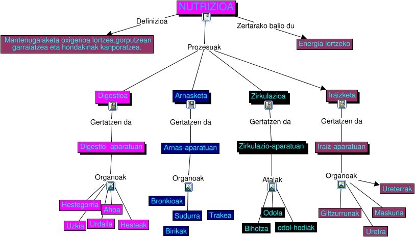 This Concept Map, created with IHMC CmapTools, has information related to: NUTRIZIOA, NUTRIZIOA Definizioa Mantenugaiaketa oxigenoa lortzea,gorputzean garraiatzea eta hondakinak kanporatzea., Iraiz-aparatuan Organoak Maskuria, Iraizketa Gertatzen da Iraiz-aparatuan, Digestio- aparatuan Organoak Ahoa, Digestio- aparatuan Organoak Hesteak, Digestioa Gertatzen da Digestio- aparatuan, NUTRIZIOA Prozesuak Arnasketa, Arnasketa Gertatzen da Arnas-aparatuan, NUTRIZIOA Prozesuak Zirkulazioa, Iraiz-aparatuan Organoak Uretra, NUTRIZIOA Zertarako balio du Energia lortzeko, Iraiz-aparatuan Organoak Giltzurrunak, Digestio- aparatuan Organoak Hestegorria, NUTRIZIOA Prozesuak Iraizketa, NUTRIZIOA Prozesuak Digestioa, Zirkulazio-aparatuan Atalak Odola, Iraiz-aparatuan Organoak Ureterrak, Zirkulazioa Gertatzen da Zirkulazio-aparatuan, Digestio- aparatuan Organoak Urdaila, Arnas-aparatuan Organoak Sudurra