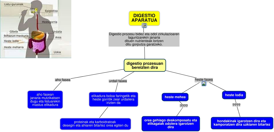 This Concept Map, created with IHMC CmapTools, has information related to: digestioa, heste mehea ???? orea gehiago deskomposatu eta elikagaiak odolera igarotzen dira, DIGESTIO APARATUA Digestio prozesu bidez eta odol zirkulazioaren laguntzarekin janaria dituen nutrienteak lortzen ditu gorputza garatzeko. digestio prozesuan bereizten dira, digestio prozesuan bereizten dira aho fasea aho fasean janaria mutzikatsen dugu eta listuarekin mastus elikadura, digestio prozesuan bereizten dira heste fasea heste lodia, digestio prozesuan bereizten dira urdail fasea elikadura boloa faringetik eta heste gorritik zear urdailera irizten da, elikadura boloa faringetik eta heste gorritik zear urdailera irizten da proteinak eta karboidratoak desegin eta ahiaren bitartez orea egiten du, digestio prozesuan bereizten dira heste fasea heste mehea, heste lodia ???? hondakinak igarotzen dira eta kamporatzen dira uzkiaren bitartez