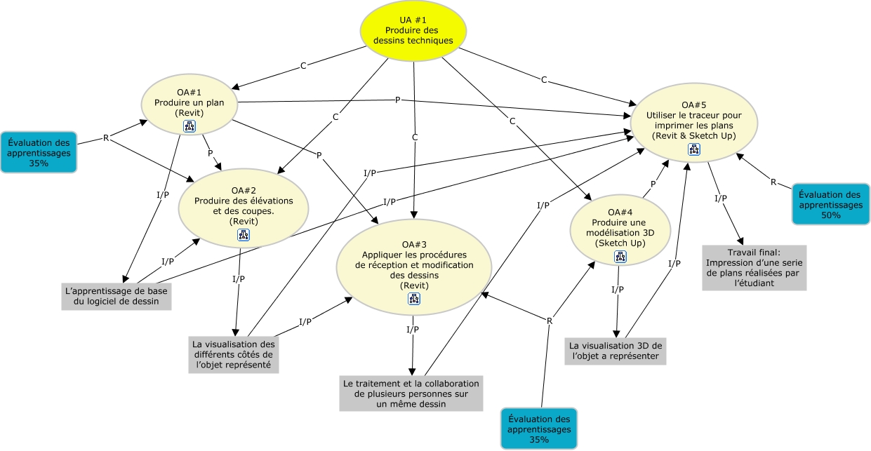 This Concept Map, created with IHMC CmapTools, has information related to: UA1 Produire des dessins techniques, L’apprentissage de base du logiciel de dessin I/P OA#2 Produire des élévations et des coupes. (Revit), OA#4 Produire une modélisation 3D (Sketch Up) I/P La visualisation 3D de l’objet a représenter, La visualisation des différents côtés de l’objet représenté I/P OA#3 Appliquer les procédures de réception et modification des dessins (Revit), OA#1 Produire un plan (Revit) P OA#5 Utiliser le traceur pour imprimer les plans (Revit & Sketch Up), Évaluation des apprentissages 35% R OA#2 Produire des élévations et des coupes. (Revit), OA#5 Utiliser le traceur pour imprimer les plans (Revit & Sketch Up) I/P Travail final: Impression d’une serie de plans réalisées par l’étudiant, Évaluation des apprentissages 50% R OA#5 Utiliser le traceur pour imprimer les plans (Revit & Sketch Up), Évaluation des apprentissages 35% R OA#1 Produire un plan (Revit), Évaluation des apprentissages 35% R OA#3 Appliquer les procédures de réception et modification des dessins (Revit), Le traitement et la collaboration de plusieurs personnes sur un même dessin I/P OA#5 Utiliser le traceur pour imprimer les plans (Revit & Sketch Up), OA#4 Produire une modélisation 3D (Sketch Up) P OA#5 Utiliser le traceur pour imprimer les plans (Revit & Sketch Up), UA #1 Produire des dessins techniques C OA#4 Produire une modélisation 3D (Sketch Up), L’apprentissage de base du logiciel de dessin I/P OA#5 Utiliser le traceur pour imprimer les plans (Revit & Sketch Up), UA #1 Produire des dessins techniques C OA#5 Utiliser le traceur pour imprimer les plans (Revit & Sketch Up), OA#2 Produire des élévations et des coupes. (Revit) I/P La visualisation des différents côtés de l’objet représenté, OA#3 Appliquer les procédures de réception et modification des dessins (Revit) I/P Le traitement et la collaboration de plusieurs personnes sur un même dessin, Évaluation des apprentissages 35% R OA#4 Produire une modélisation 3D (Sketch Up), La visualisation des différents côtés de l’objet représenté I/P OA#5 Utiliser le traceur pour imprimer les plans (Revit & Sketch Up), La visualisation 3D de l’objet a représenter I/P OA#5 Utiliser le traceur pour imprimer les plans (Revit & Sketch Up), OA#1 Produire un plan (Revit) P OA#3 Appliquer les procédures de réception et modification des dessins (Revit)