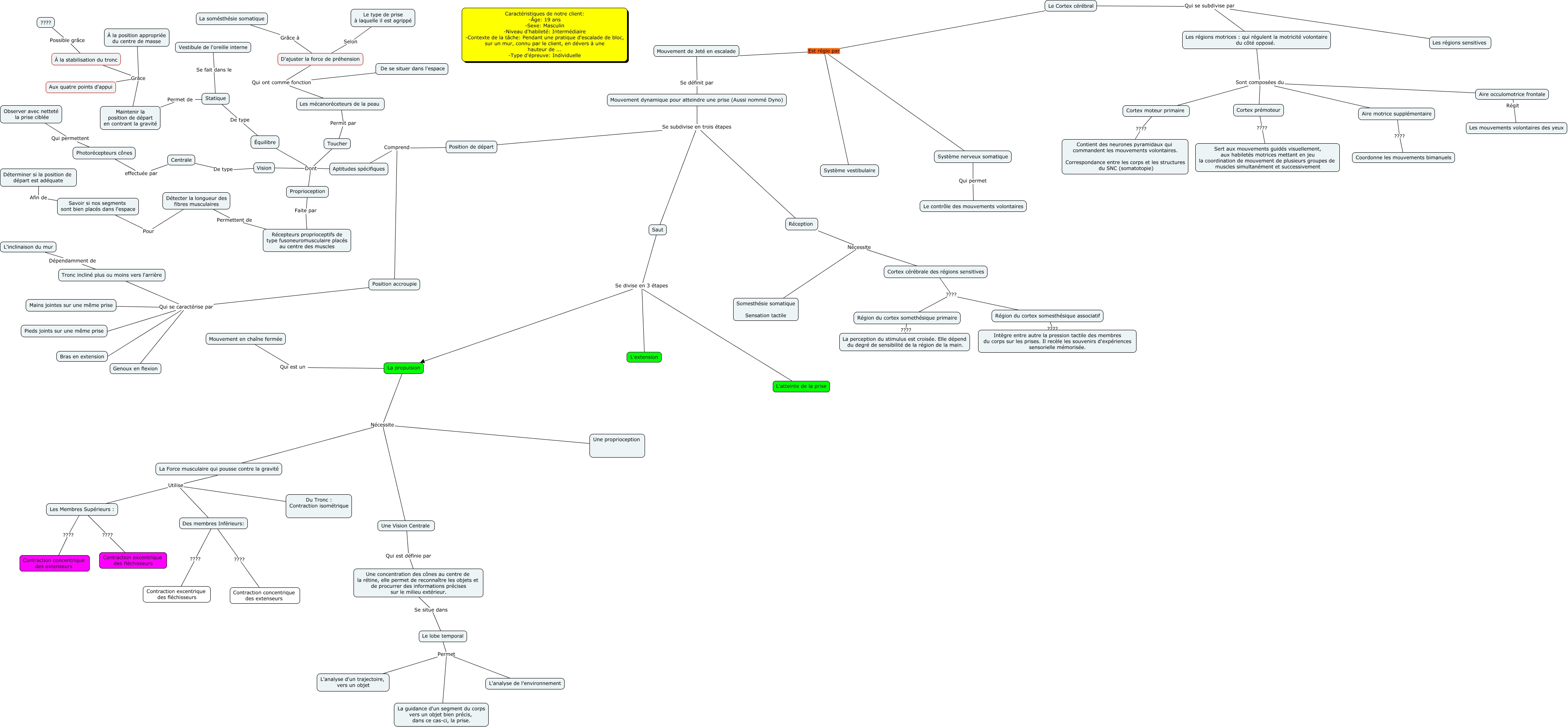 This Concept Map, created with IHMC CmapTools, has information related to: dyno.neuro, Savoir si nos segments sont bien placés dans l'espace Afin de Déterminer si la position de départ est adéquate, Une Vision Centrale Nécessite La propulsion, Région du cortex somesthésique associatif ???? Région du cortex somethésique primaire, Cortex prémoteur Sont composées du Les régions motrices : qui régulent la motricité volontaire du côté opposé., Maintenir la position de départ en contrant la gravité Grâce Aux quatre points d'appui, Le Cortex cérébral Est régie par Système nerveux somatique, Récepteurs proprioceptifs de type fusoneuromusculaire placés au centre des muscles Permettent de Détecter la longueur des fibres musculaires, Statique Se fait dans le Vestibule de l'oreille interne, Aptitudes spécifiques Dont Toucher, Position accroupie Qui se caractérise par Tronc incliné plus ou moins vers l'arrière, À la stabilisation du tronc Possible grâce ????, Cortex cérébrale des régions sensitives ???? Région du cortex somethésique primaire, Intègre entre autre la pression tactile des membres du corps sur les prises. Il recèle les souvenirs d'expériences sensorielle mémorisée. ???? Région du cortex somesthésique associatif, Position accroupie Qui se caractérise par Genoux en flexion, Des membres Inférieurs: Utilise La Force musculaire qui pousse contre la gravité, Maintenir la position de départ en contrant la gravité Grâce À la position appropriée du centre de masse, Contient des neurones pyramidaux qui commandent les mouvements volontaires. Correspondance entre les corps et les structures du SNC (somatotopie) ???? Cortex moteur primaire, L'extension Se divise en 3 étapes La propulsion, Position de départ Comprend Position accroupie, Mouvement dynamique pour atteindre une prise (Aussi nommé Dyno) Se subdivise en trois étapes Saut