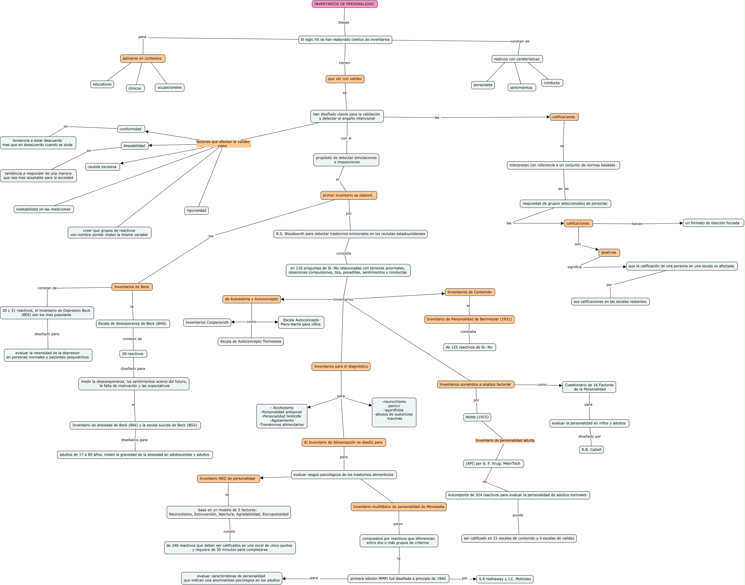 Este Cmap, tiene información relacionada con: inventarios de personalidad, Inventario de Personalidad de Bernreuter (1931) constaba de 125 reactivos de Si- No, primera edición MMPI fué diseñada a principis de 1940 por S.R Hathaway y J.C. McKinley, primer inventario se elaboró los Inventarios de Beck, Autoreporte de 324 reactivos para evaluar la personalidad de adultos normales puede ser calificado en 21 escalas de contenido y 4 escalas de validez, Inventarios de Beck constan de 20 y 21 reactivos, el inventario de Depresion Beck (BDI) son los mas populares, conformidad es tendencia a estar deacuerdo mas que en desacuerdo cuando se duda, primera edición MMPI fué diseñada a principis de 1940 para evaluar caracteristicas de personalidad que indican una anormalidad psicológica en los adultos, de Autoestima y Autoconcepto como Inventarios Coopersmith, El siglo XX se han elaborado cientos de inventarios tienen que ver con validez, en 116 preguntas de Si -No relacionadas con temores anormales, obseciones compulsiones, tics, pesadillas, sentimientos y conductas Inventarios Inventarios sometidos a analisis factorial, en 116 preguntas de Si -No relacionadas con temores anormales, obseciones compulsiones, tics, pesadillas, sentimientos y conductas Inventarios Inventarios para el diagnóstico, evaluar rasgos psicológicos de los trastornos alimenticios ???? Inventario NEO de personalidad, El siglo XX se han elaborado cientos de inventarios constan de reativos con carateristicas, compuestos por reactivos que diferencian entre dos o más grupos de criterios la primera edición MMPI fué diseñada a principis de 1940, INVENTARIOS DE PERSONALIDAD Desde El siglo XX se han elaborado cientos de inventarios, Inventarios sometidos a analisis factorial por Webb (1915), calificaciones tienen un formato de elección forzada, Inventarios de Contenido el Inventario de Personalidad de Bernreuter (1931), aplicarse en contextos ???? clinicos, Webb (1915) Inventario de personalidad adulta (API) por S. F. Krug; MetriTech