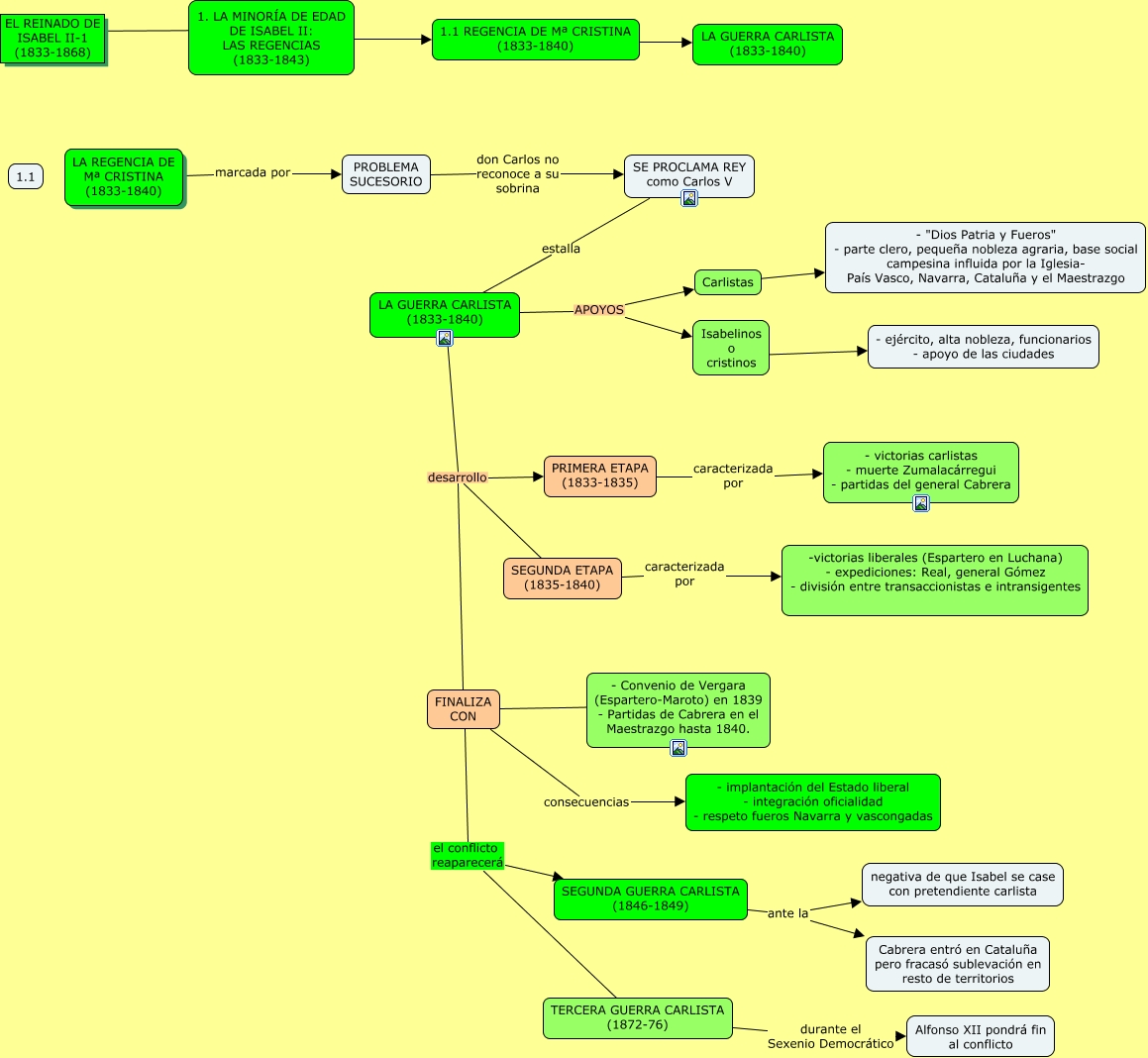 Este Cmap, tiene información relacionada con: ISABEL II-1, LA GUERRA CARLISTA (1833-1840) APOYOS Carlistas, FINALIZA CON el conflicto reaparecerá SEGUNDA GUERRA CARLISTA (1846-1849), PROBLEMA SUCESORIO don Carlos no reconoce a su sobrina SE PROCLAMA REY como Carlos V, LA GUERRA CARLISTA (1833-1840) desarrollo FINALIZA CON, SE PROCLAMA REY como Carlos V estalla LA GUERRA CARLISTA (1833-1840), Carlistas ???? - "Dios Patria y Fueros" - parte clero, pequeña nobleza agraria, base social campesina influida por la Iglesia- País Vasco, Navarra, Cataluña y el Maestrazgo, Isabelinos o cristinos ???? - ejército, alta nobleza, funcionarios - apoyo de las ciudades, FINALIZA CON ???? - Convenio de Vergara (Espartero-Maroto) en 1839 - Partidas de Cabrera en el Maestrazgo hasta 1840., PRIMERA ETAPA (1833-1835) caracterizada por - victorias carlistas - muerte Zumalacárregui - partidas del general Cabrera, SEGUNDA ETAPA (1835-1840) caracterizada por -victorias liberales (Espartero en Luchana) - expediciones: Real, general Gómez - división entre transaccionistas e intransigentes, FINALIZA CON el conflicto reaparecerá TERCERA GUERRA CARLISTA (1872-76), TERCERA GUERRA CARLISTA (1872-76) durante el Sexenio Democrático Alfonso XII pondrá fin al conflicto, EL REINADO DE ISABEL II-1 (1833-1868) ???? ????, 1. LA MINORÍA DE EDAD DE ISABEL II: LAS REGENCIAS (1833-1843) ???? 1.1 REGENCIA DE Mª CRISTINA (1833-1840), LA GUERRA CARLISTA (1833-1840) desarrollo SEGUNDA ETAPA (1835-1840), 1.1 REGENCIA DE Mª CRISTINA (1833-1840) ???? LA GUERRA CARLISTA (1833-1840), LA GUERRA CARLISTA (1833-1840) APOYOS Isabelinos o cristinos, SEGUNDA GUERRA CARLISTA (1846-1849) ante la Cabrera entró en Cataluña pero fracasó sublevación en resto de territorios, LA REGENCIA DE Mª CRISTINA (1833-1840) marcada por PROBLEMA SUCESORIO, FINALIZA CON consecuencias - implantación del Estado liberal - integración oficialidad - respeto fueros Navarra y vascongadas