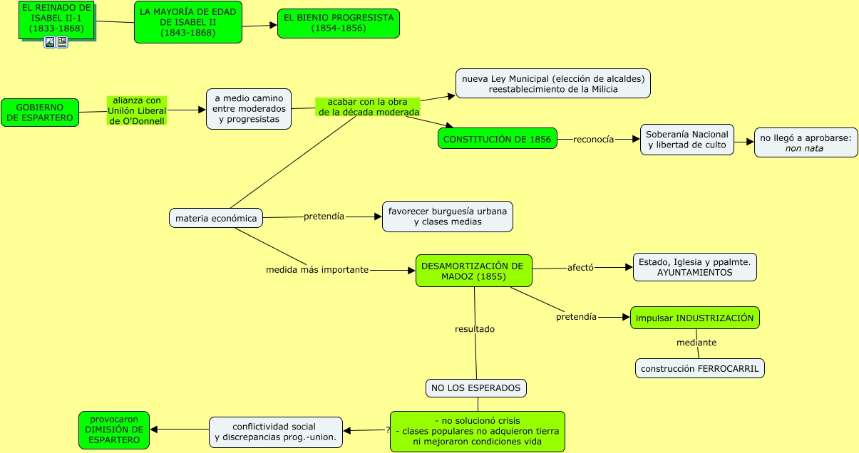 Este Cmap, tiene información relacionada con: ISABEL II-5-BIENIO, CONSTITUCIÓN DE 1856 reconocía Soberanía Nacional y libertad de culto, LA MAYORÍA DE EDAD DE ISABEL II (1843-1868) ???? EL BIENIO PROGRESISTA (1854-1856), DESAMORTIZACIÓN DE MADOZ (1855) resultado NO LOS ESPERADOS, Soberanía Nacional y libertad de culto ???? no llegó a aprobarse: non nata, conflictividad social y discrepancias prog.-union. ???? provocaron DIMISIÓN DE ESPARTERO, materia económica medida más importante DESAMORTIZACIÓN DE MADOZ (1855), DESAMORTIZACIÓN DE MADOZ (1855) afectó Estado, Iglesia y ppalmte. AYUNTAMIENTOS, GOBIERNO DE ESPARTERO alianza con Unilón Liberal de O'Donnell a medio camino entre moderados y progresistas, DESAMORTIZACIÓN DE MADOZ (1855) pretendía impulsar INDUSTRIZACIÓN, a medio camino entre moderados y progresistas acabar con la obra de la década moderada CONSTITUCIÓN DE 1856, a medio camino entre moderados y progresistas acabar con la obra de la década moderada nueva Ley Municipal (elección de alcaldes) reestablecimiento de la Milicia, EL REINADO DE ISABEL II-1 (1833-1868) ???? LA MAYORÍA DE EDAD DE ISABEL II (1843-1868), - no solucionó crisis - clases populares no adquieron tierra ni mejoraron condiciones vida ???? conflictividad social y discrepancias prog.-union., impulsar INDUSTRIZACIÓN mediante construcción FERROCARRIL, materia económica pretendía favorecer burguesía urbana y clases medias, NO LOS ESPERADOS ???? - no solucionó crisis - clases populares no adquieron tierra ni mejoraron condiciones vida, a medio camino entre moderados y progresistas acabar con la obra de la década moderada materia económica