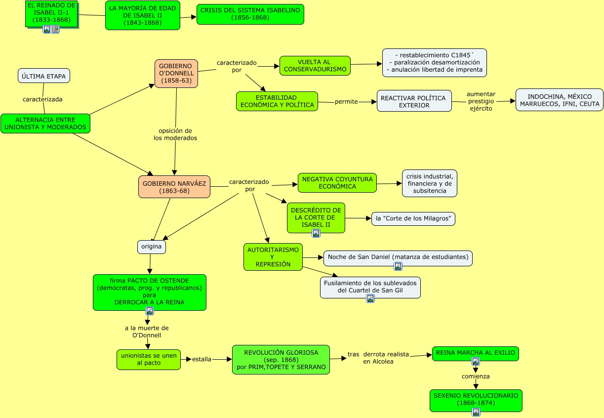 Este Cmap, tiene información relacionada con: ISABEL II-6-CRISIS REINADO, AUTORITARISMO Y REPRESIÓN ???? Noche de San Daniel (matanza de estudiantes), ALTERNACIA ENTRE UNIONISTA Y MODERADOS ???? GOBIERNO NARVÁEZ (1863-68), AUTORITARISMO Y REPRESIÓN ???? Fusilamiento de los sublevados del Cuartel de San Gil, GOBIERNO O'DONNELL (1858-63) caracterizado por VUELTA AL CONSERVADURISMO, EL REINADO DE ISABEL II-1 (1833-1868) ???? LA MAYORÍA DE EDAD DE ISABEL II (1843-1868), GOBIERNO NARVÁEZ (1863-68) caracterizado por AUTORITARISMO Y REPRESIÓN, ALTERNACIA ENTRE UNIONISTA Y MODERADOS ???? GOBIERNO O'DONNELL (1858-63), REVOLUCIÓN GLORIOSA (sep. 1868) por PRIM,TOPETE Y SERRANO tras derrota realista en Alcolea REINA MARCHA AL EXILIO, ESTABILIDAD ECONÓMICA Y POLÍTICA permite REACTIVAR POLÍTICA EXTERIOR, GOBIERNO O'DONNELL (1858-63) opsición de los moderados GOBIERNO NARVÁEZ (1863-68), GOBIERNO NARVÁEZ (1863-68) origina firma PACTO DE OSTENDE (demócratas, prog. y republicanos) para DERROCAR A LA REINA, NEGATIVA COYUNTURA ECONÓMICA ???? crisis industrial, financiera y de subsitencia, DESCRÉDITO DE LA CORTE DE ISABEL II ???? la "Corte de los Milagros", unionistas se unen al pacto estalla REVOLUCIÓN GLORIOSA (sep. 1868) por PRIM,TOPETE Y SERRANO, GOBIERNO NARVÁEZ (1863-68) caracterizado por origina, firma PACTO DE OSTENDE (demócratas, prog. y republicanos) para DERROCAR A LA REINA a la muerte de O'Donnell unionistas se unen al pacto, GOBIERNO NARVÁEZ (1863-68) caracterizado por NEGATIVA COYUNTURA ECONÓMICA, GOBIERNO NARVÁEZ (1863-68) caracterizado por DESCRÉDITO DE LA CORTE DE ISABEL II, ÚLTIMA ETAPA caracterizada ALTERNACIA ENTRE UNIONISTA Y MODERADOS, VUELTA AL CONSERVADURISMO ???? - restablecimiento C1845´ - paralización desamortización - anulación libertad de imprenta
