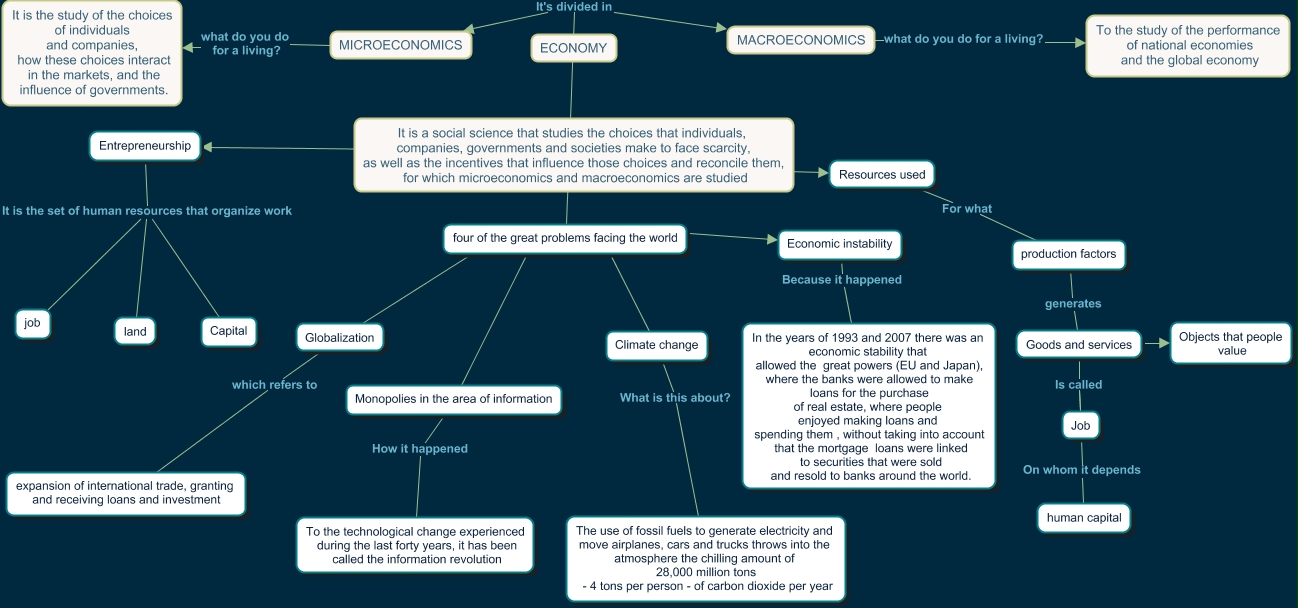 Este Cmap, tiene información relacionada con: mapa cap 1 LINK, four of the great problems facing the world It's divided in MACROECONOMICS, It is a social science that studies the choices that individuals, companies, governments and societies make to face scarcity, as well as the incentives that influence those choices and reconcile them, for which microeconomics and macroeconomics are studied ???? Resources used, MICROECONOMICS what do you do for a living? It is the study of the choices of individuals and companies, how these choices interact in the markets, and the influence of governments., four of the great problems facing the world ???? Monopolies in the area of information, It is a social science that studies the choices that individuals, companies, governments and societies make to face scarcity, as well as the incentives that influence those choices and reconcile them, for which microeconomics and macroeconomics are studied ???? Entrepreneurship, Entrepreneurship It is the set of human resources that organize work job, four of the great problems facing the world ???? Globalization, four of the great problems facing the world ???? Climate change, Goods and services ???? Objects that people value, Entrepreneurship It is the set of human resources that organize work land, four of the great problems facing the world It's divided in MICROECONOMICS, Economic instability Because it happened In the years of 1993 and 2007 there was an economic stability that allowed the great powers (EU and Japan), where the banks were allowed to make loans for the purchase of real estate, where people enjoyed making loans and spending them , without taking into account that the mortgage loans were linked to securities that were sold and resold to banks around the world., Goods and services Is called Job, Entrepreneurship It is the set of human resources that organize work Capital, production factors generates Goods and services, Climate change What is this about? The use of fossil fuels to generate electricity and move airplanes, cars and trucks throws into the atmosphere the chilling amount of 28,000 million tons - 4 tons per person - of carbon dioxide per year, Job On whom it depends human capital, Monopolies in the area of information How it happened To the technological change experienced during the last forty years, it has been called the information revolution, Resources used For what production factors, MACROECONOMICS what do you do for a living? To the study of the performance of national economies and the global economy