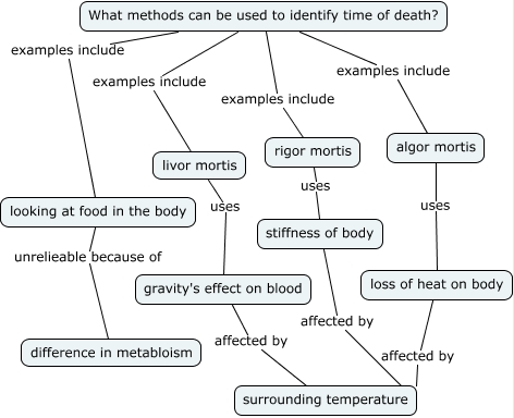 This Concept Map, created with IHMC CmapTools, has information related to: time of death, What methods can be used to identify time of death? examples include algor mortis, stiffness of body affected by surrounding temperature, What methods can be used to identify time of death? examples include rigor mortis, gravity's effect on blood affected by surrounding temperature, What methods can be used to identify time of death? examples include livor mortis, looking at food in the body unrelieable because of difference in metabloism, loss of heat on body affected by surrounding temperature, rigor mortis uses stiffness of body, livor mortis uses gravity's effect on blood, What methods can be used to identify time of death? examples include looking at food in the body, algor mortis uses loss of heat on body