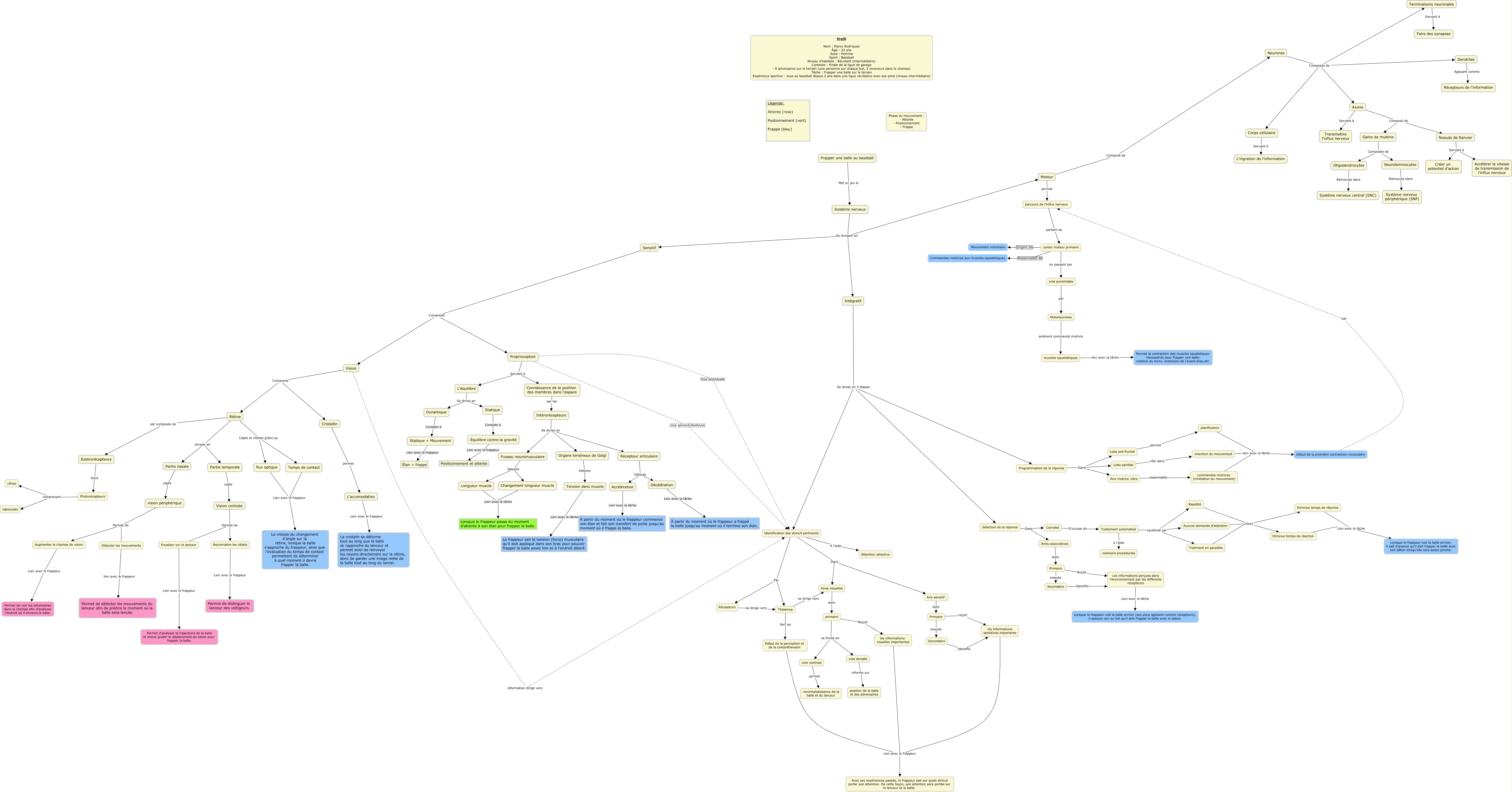 Cette carte de concepts créée avec IHMC CmapTools traite de: Frapper une balle (karo), Sélection de la réponse Dans Cervelet, primaire se divise en voie ventrale, Photorécepteurs comprenant cônes, Changement longueur muscle Lien avec la tâche Lorsque le frappeur passe du moment d'attente à son élan pour frapper la balle., L'accomodation Lien avec le frappeur La cristalin se déforme tout au long que la balle se rapproche du lanceur et permet ainsi de renvoyer les rayons directement sur la rétine, donc de garder une image nette de la balle tout au long du lancer., Neurones Composés de Axone, Proprioception voie spinocérébelleuse Identification des stimuli pertinents, L'équilibre Se divise en Statique, cortex moteur primaire Origine de Mouvement volontaire, Accélération Lien avec la tâche À partir du moment où le frappeur commence son élan et fait son transfert de poids jusqu'au moment où il frappe la balle., Identification des stimuli pertinents Dans Aire sensitif, Intégratif Se divise en 3 étapes Identification des stimuli pertinents, Focaliser sur le lanceur Lien avec le frappeur Permet d'analyser la trajectoire de la balle et mieux guider le déplacement du baton pour frapper la balle., Traitment en parallèle Alors Diminue temps de réaction, intention du mouvement lien avec la tâche Début de la première contraction musculaire, Identification des stimuli pertinents Par Thalamus, Aire sensitif dont Primaire, planification lien avec la tâche Début de la première contraction musculaire, cortex moteur primaire Responsable de Commandes motrices aux muscles squelettiques, Aucune demande d'attention Alors Diminue temps de réaction