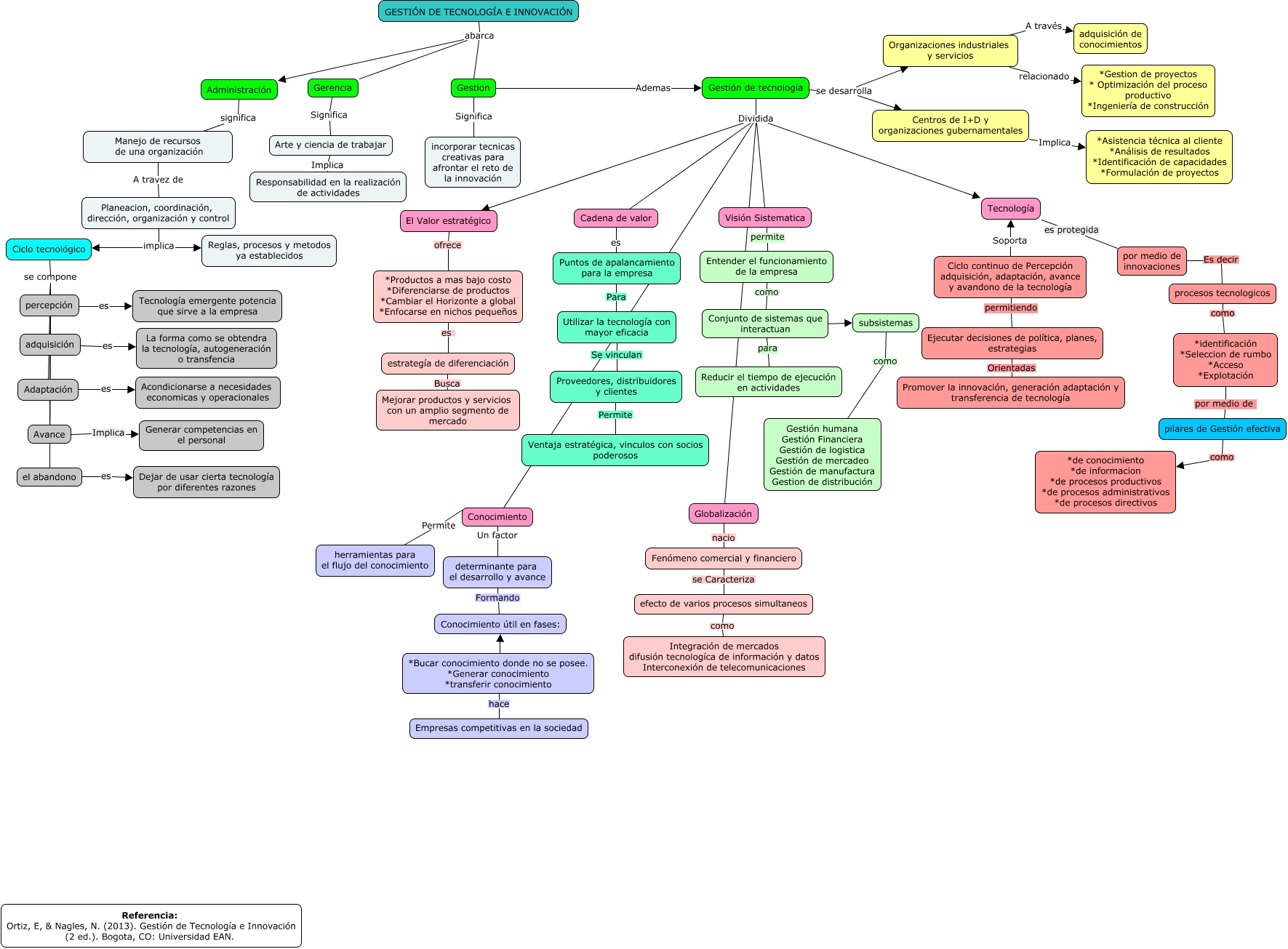 Este Cmap, tiene información relacionada con: Gestion de Tecnología e innovación, Organizaciones industriales y servicios relacionado *Gestion de proyectos * Optimización del proceso productivo *Ingeniería de construcción, GESTIÓN DE TECNOLOGÍA E INNOVACIÓN abarca Gestion, Arte y ciencia de trabajar Implica Responsabilidad en la realización de actividades, Conocimiento Un factor determinante para el desarrollo y avance, Planeacion, coordinación, dirección, organización y control implica Ciclo tecnológico, Entender el funcionamiento de la empresa como Conjunto de sistemas que interactuan, Gestión de tecnología Dividida Cadena de valor, Gestión de tecnología Dividida Tecnología, Cadena de valor es Puntos de apalancamiento para la empresa, percepción es Tecnología emergente potencia que sirve a la empresa, estrategía de diferenciación Busca Mejorar productos y servicios con un amplio segmento de mercado, Gestion Ademas Gestión de tecnología, Fenómeno comercial y financiero se Caracteriza efecto de varios procesos simultaneos, Globalización nacio Fenómeno comercial y financiero, Adaptación es Acondicionarse a necesidades economicas y operacionales, efecto de varios procesos simultaneos como Integración de mercados difusión tecnologíca de información y datos Interconexión de telecomunicaciones, Avance Implica Generar competencias en el personal, Ciclo tecnológico se compone Adaptación, Conjunto de sistemas que interactuan para Reducir el tiempo de ejecución en actividades, Manejo de recursos de una organización A travez de Planeacion, coordinación, dirección, organización y control