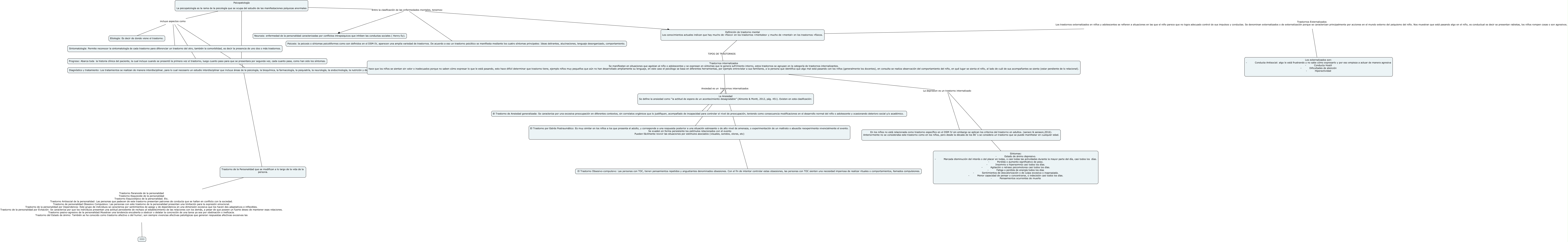 Este Cmap, tiene información relacionada con: psicipatologia de la Infancia y la Adolescencia, Psicopatología La psicopatología es la rama de la psicología que se ocupa del estudio de las manifestaciones psíquicas anormales Entre la clasificación de las enfermedades mentales, tenemos: Psicosis: la psicosis o síntomas psicotiformes como son definidos en el DSM-IV, aparecen una amplia variedad de trastornos. De acuerdo a eso un trastorno psicótico se manifiesta mediante los cuatro síntomas principales: Ideas delirantes, alucinaciones, lenguaje desorganizado, comportamiento., Trastornos internalizados Se manifiestan en situaciones que agobian al niño o adolescentes y se expresan en síntomas que le genera sufrimiento interno, estos trastornos se agrupan en la categoría de trastornos internalizantes. hace que los niños se sientan sin valor o inadecuados porque no saben cómo expresar lo que le está pasando, esto hace difícil determinar que trastorno tiene, ejemplo niños muy pequeños que aún no han desarrollado ampliamente su lenguaje, en este caso el psicólogo se basa en diferentes herramientas, por ejemplo entrevistar a sus familiares, a la persona que identifica que algo mal está pasando con los niños (generalmente los docentes), en consulta se realiza observación del comportamiento del niño, en qué lugar se sienta el niño, al lado de cuál de sus acompañantes se sienta (estar pendiente de lo relacional). La depresion es un trastorno internalizado Síntomas: - Estado de ánimo depresivo. - Marcada disminución del interés o del placer en todas, o casi todas las actividades durante la mayor parte del día, casi todos los días. - Perdida o aumento significativo de peso. - Insomnio o hipersomnia casi todos los días. - Agitación o retraso psicomotores casi todos los días. - Fatiga o perdida de energía todos los días - Sentimientos de desvalorización o de culpa excesiva o inapropiada. - Menor capacidad de pensar o concentrarse, o indecisión casi todos los días. - Pensamientos ocurrentes de muerte, Trastornos internalizados Se manifiestan en situaciones que agobian al niño o adolescentes y se expresan en síntomas que le genera sufrimiento interno, estos trastornos se agrupan en la categoría de trastornos internalizantes. hace que los niños se sientan sin valor o inadecuados porque no saben cómo expresar lo que le está pasando, esto hace difícil determinar que trastorno tiene, ejemplo niños muy pequeños que aún no han desarrollado ampliamente su lenguaje, en este caso el psicólogo se basa en diferentes herramientas, por ejemplo entrevistar a sus familiares, a la persona que identifica que algo mal está pasando con los niños (generalmente los docentes), en consulta se realiza observación del comportamiento del niño, en qué lugar se sienta el niño, al lado de cuál de sus acompañantes se sienta (estar pendiente de lo relacional). Ansiedad es un trastornos internalizados El Trastorno por Estrés Postraumático: Es muy similar en los niños a los que presenta el adulto, y corresponde a una respuesta posterior a una situación estresante o de alto nivel de amenaza, o experimentación de un maltrato o abusoSe reexperimenta vivencialmente el evento. Se evaden en forma persistente los estímulos relacionados con el evento Pueden fácilmente revivir las situaciones por estímulos asociados (visuales, sonidos, olores, etc), Psicopatología La psicopatología es la rama de la psicología que se ocupa del estudio de las manifestaciones psíquicas anormales incluye aspectos como Progreso: Abarca toda la historia clínica del paciente, la cual incluye cuando se presentó la primera vez el trastorno, luego cuanto paso para que se presentara por segunda vez, cada cuanto pasa, como han sido los síntomas., Trastornos internalizados Se manifiestan en situaciones que agobian al niño o adolescentes y se expresan en síntomas que le genera sufrimiento interno, estos trastornos se agrupan en la categoría de trastornos internalizantes. hace que los niños se sientan sin valor o inadecuados porque no saben cómo expresar lo que le está pasando, esto hace difícil determinar que trastorno tiene, ejemplo niños muy pequeños que aún no han desarrollado ampliamente su lenguaje, en este caso el psicólogo se basa en diferentes herramientas, por ejemplo entrevistar a sus familiares, a la persona que identifica que algo mal está pasando con los niños (generalmente los docentes), en consulta se realiza observación del comportamiento del niño, en qué lugar se sienta el niño, al lado de cuál de sus acompañantes se sienta (estar pendiente de lo relacional). La depresion es un trastorno internalizado En los niños no está relacionada como trastorno específico en el DSM IV sin embargo se aplican los criterios del trastorno en adultos. (saraon & sarason,2016). Anteriormente no se consideraba este trastorno como en los niños, pero desde la década de los 80´s se considera un trastorno que se puede manifestar en cualquier edad., Psicopatología La psicopatología es la rama de la psicología que se ocupa del estudio de las manifestaciones psíquicas anormales incluye aspectos como Diagnóstico y tratamiento: Los tratamientos se realizan de manera interdisciplinar, para lo cual necesario un estudio interdisciplinar que incluye áreas de la psicología, la bioquímica, la farmacología, la psiquiatría, la neurología, la endocrinología, la nutrición y dietética, la pedagogía, la pediatra y el trabajador social., Trastorno de la Personalidad que se modifican a lo largo de la vida de la persona. Trastorno Paranoide de la personalidad Trastorno Esquizoide de la personalidad Trastorno Esquizotípico de la personalidad. Etc. Trastorno Antisocial de la personalidad: Las personas que padecen de este trastorno presentan patrones de conducta que se hallan en conflicto con la sociedad. Trastorno de personalidad Obsesivo Compulsivo: Las personas con este trastorno de la pers