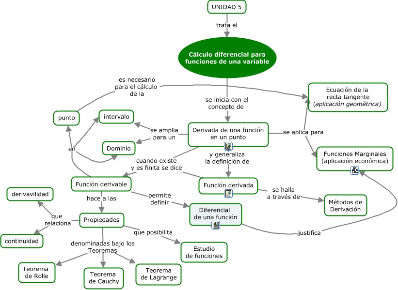 Este Cmap, tiene información relacionada con: UNIDAD 5 CALCULO DIFERENCIAL, Cálculo diferencial para funciones de una variable se inicia con el concepto de Derivada de una función en un punto, UNIDAD 5 trata el Cálculo diferencial para funciones de una variable, Propiedades que posibilita Estudio de funciones, Función derivada cuando existe y es finita se dice Función derivable, Propiedades que relaciona derivavilidad, Función derivable hace a las Propiedades, Derivada de una función en un punto y generaliza la definición de Función derivada, Derivada de una función en un punto se amplia para un Dominio, Derivada de una función en un punto cuando existe y es finita se dice Función derivable, Derivada de una función en un punto se aplica para Ecuación de la recta tangente (aplicación geométrica), Diferencial de una función justifica Funciones Marginales (aplicación económica), Propiedades denominadas bajo los Teoremas Teorema de Lagrange, Función derivable en punto, Derivada de una función en un punto se amplia para un intervalo, Propiedades que relaciona continuidad, Propiedades denominadas bajo los Teoremas Teorema de Cauchy, Función derivada se halla a través de Métodos de Derivación, Función derivable en Dominio, Derivada de una función en un punto se aplica para Funciones Marginales (aplicación económica), punto es necesario para el cálculo de la Ecuación de la recta tangente (aplicación geométrica)
