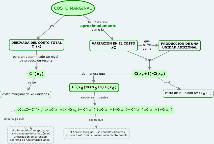de producción resulta </mtext> </mrow> </math> <math xmlns="http://www.w3.org/1998/Math/MathML"> <mrow> <mtext> C´( </mtext> <mmultiscripts> <mtext> x </mtext> <mtext> 0 </mtext> <none/> </mmultiscripts> <mtext> ) </mtext> </mrow> </math>, PRODUCCION DE UNA UNIDAD ADICIONAL o sea <math xmlns="http://www.w3.org/1998/Math/MathML"> <mrow> <mtext> C( </mtext> <mmultiscripts> <mtext> x </mtext> <mtext> 0 </mtext> <none/> </mmultiscripts> <mtext> +1)-C( </mtext> <mmultiscripts> <mtext> x </mtext> <mtext> 0 </mtext> <none/> </mmultiscripts> <mtext> ) </mtext> </mrow> </math>, COSTO MARGINAL se interpreta aproximadamente como la VARIACION EN EL COSTO ΔC, <math xmlns="http://www.w3.org/1998/Math/MathML"> <mrow> <mtext> dC≅ΔC⇔C´( </mtext> <mmultiscripts> <mtext> x </mtext> <mtext> 0 </mtext> <none/> </mmultiscripts> <mtext> ).Δx </mtext> <mrow> <mtext> ≅C( </mtext> <mmultiscripts> <mtext> x </mtext> <mtext> 0 </mtext> <none/> </mmultiscripts> <mtext> +Δx)-C( </mtext> <mmultiscripts> <mtext> x </mtext> <mtext> 0 </mtext> <none/> </mmultiscripts> <mtext> )⇔ </mtext> <mrow> <mtext> C´( </mtext> <mmultiscripts> <mtext> x </mtext> <mtext> 0 </mtext> <none/> </mmultiscripts> <mtext> ).1 </mtext> <mrow> <mtext> ≅C( </mtext> <mmultiscripts> <mtext> x </mtext> <mtext> 0 </mtext> <none/> </mmultiscripts> <mtext> +1)-C( </mtext> <mmultiscripts> <mtext> x </mtext> <mtext> 0 </mtext> <none/> </mmultiscripts> <mtext> )⇔ </mtext> <mrow> <mtext> C´( </mtext> <mmultiscripts> <mtext> x </mtext> <mtext> 0 </mtext> <none/> </mmultiscripts> <mtext> ) </mtext> <mrow> <mtext> ≅C( </mtext> <mmultiscripts> <mtext> x </mtext> <mtext> 0 </mtext> <none/> </mmultiscripts> <mtext> +1)-C( </mtext> <mmultiscripts> <mtext> x </mtext> <mtext> 0 </mtext> <none/> </mmultiscripts> <mtext> ) </mtext> </mrow> </mrow> </mrow> </mrow> </mrow> </mrow> </math> se parte de que el diferencial dC se aproxima al incremento de la función ΔC (Linealización de la función - Teorema de Apoximación Lineal), <math xmlns="http://www.w3.org/1998/Math/MathML"> <mrow> <mtext> C´( </mtext> <mmultiscripts> <mtext> x </mtext> <mtext> 0 </mtext> <none/> </mmultiscripts> <mtext> )≅C( </mtext> <mmultiscripts> <mtext> x </mtext> <mtext> 0 </mtext> <none/> </mmultiscripts> <mtext> +1)-C( </mtext> <mmultiscripts> <mtext> x </mtext> <mtext> 0 </mtext> <none/> </mmultiscripts> <mtext> ) </mtext> </mrow> </math> según se muestra <math xmlns="http://www.w3.org/1998/Math/MathML"> <mrow> <mtext> dC≅ΔC⇔C´( </mtext> <mmultiscripts> <mtext> x </mtext> <mtext> 0 </mtext> <none/> </mmultiscripts> <mtext> ).Δx </mtext> <mrow> <mtext> ≅C( </mtext> <mmultiscripts> <mtext> x </mtext> <mtext> 0 </mtext> <none/> </mmultiscripts> <mtext> +Δx)-C( </mtext> <mmultiscripts> <mtext> x </mtext> <mtext> 0 </mtext> <none/> </mmultiscripts> <mtext> )⇔ </mtext> <mrow> <mtext> C´( </mtext> <mmultiscripts> <mtext> x </mtext> <mtext> 0 </mtext> <none/> </mmultiscripts> <mtext> ).1 </mtext> <mrow> <mtext> ≅C( </mtext> <mmultiscripts> <mtext> x </mtext> <mtext> 0 </mtext> <none/> </mmultiscripts> <mtext> +1)-C( </mtext> <mmultiscripts> <mtext> x </mtext> <mtext> 0 </mtext> <none/> </mmultiscripts> <mtext> )⇔ </mtext> <mrow> <mtext> C´( </mtext> <mmultiscripts> <mtext> x </mtext> <mtext> 0 </mtext> <none/> </mmultiscripts> <mtext> ) </mtext> <mrow> <mtext> ≅C( </mtext> <mmultiscripts> <mtext> x </mtext> <mtext> 0 </mtext> <none/> </mmultiscripts> <mtext> +1)-C( </mtext> <mmultiscripts> <mtext> x </mtext> <mtext> 0 </mtext> <none/> </mmultiscripts> <mtext> ) </mtext> </mrow> </mrow> </mrow> </mrow> </mrow> </mrow> </math>