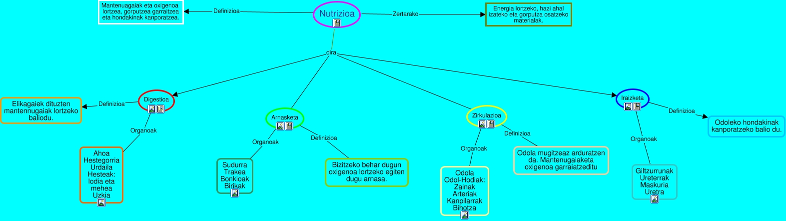 This Concept Map, created with IHMC CmapTools, has information related to: Nutrizioa Jon Diez, Nutrizioa Zertarako Energia lortzeko, hazi ahal izateko eta gorputza osatzeko materialak., Digestioa Definizioa Elikagaiek dituzten mantennugaiak lortzeko baliodu., Nutrizioa dira Iraizketa, Iraizketa Definizioa Odoleko hondakinak kanporatzeko balio du., Nutrizioa dira Zirkulazioa, Zirkulazioa Organoak Odola Odol-Hodiak: Zainak Arteriak Kanpilarrak Bihotza, Iraizketa Organoak Giltzurrunak Ureterrak Maskuria Uretra, Arnasketa Organoak Sudurra Trakea Bonkioak Birikak, Nutrizioa dira Digestioa, Digestioa Organoak Ahoa Hestegorria Urdaila Hesteak: lodia eta mehea Uzkia, Arnasketa Definizioa Bizitzeko behar dugun oxigenoa lortzeko egiten dugu arnasa., Nutrizioa Definizioa Mantenuagaiak eta oxigenoa lortzea, gorputzea garraitzea eta hondakinak kanporatzea., Zirkulazioa Definizioa Odola mugitzeaz arduratzen da. Mantenugaiaketa oxigenoa garraiatzeditu, Nutrizioa dira Arnasketa