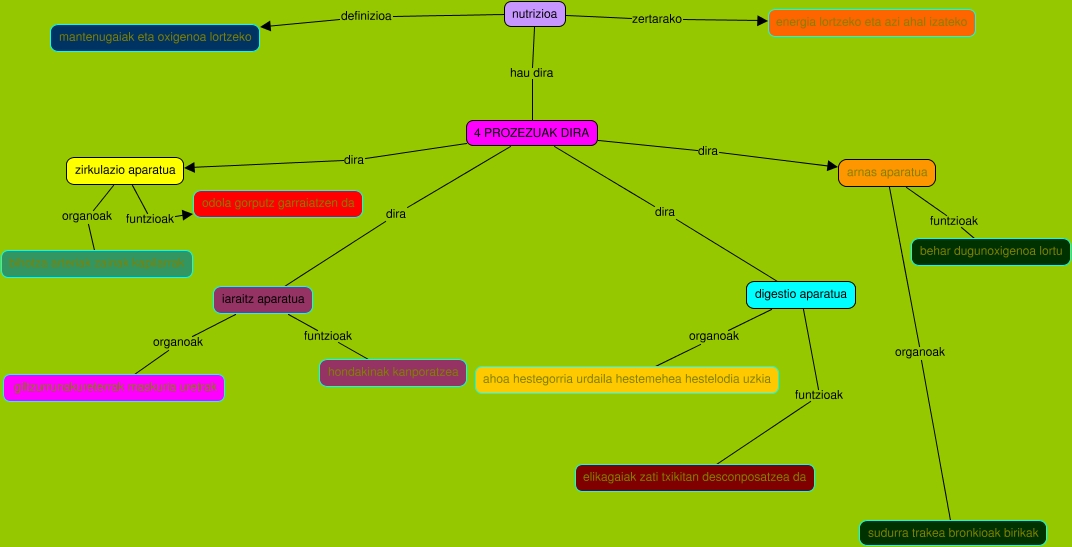 This Concept Map, created with IHMC CmapTools, has information related to: Cmap-0, arnas aparatua funtzioak behar dugunoxigenoa lortu, zirkulazio aparatua organoak bihotza arteriak zainak kapilarrak, nutrizioa zertarako energia lortzeko eta azi ahal izateko, 4 PROZEZUAK DIRA dira digestio aparatua, digestio aparatua organoak ahoa hestegorria urdaila hestemehea hestelodia uzkia, 4 PROZEZUAK DIRA dira iaraitz aparatua, iaraitz aparatua organoak giltzurrunakureterrak maskuria uretrak, arnas aparatua organoak sudurra trakea bronkioak birikak, 4 PROZEZUAK DIRA dira arnas aparatua, nutrizioa hau dira 4 PROZEZUAK DIRA, digestio aparatua funtzioak elikagaiak zati txikitan desconposatzea da, iaraitz aparatua funtzioak hondakinak kanporatzea, 4 PROZEZUAK DIRA dira zirkulazio aparatua, zirkulazio aparatua funtzioak odola gorputz garraiatzen da, nutrizioa definizioa mantenugaiak eta oxigenoa lortzeko