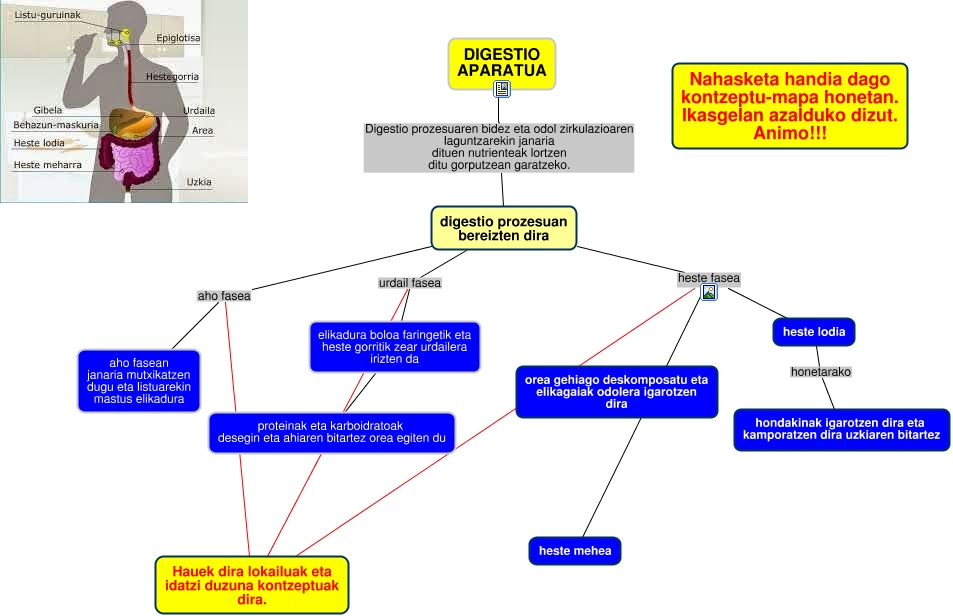 This Concept Map, created with IHMC CmapTools, has information related to: digestioa, digestio prozesuan bereizten dira aho fasea Hauek dira lokailuak eta idatzi duzuna kontzeptuak dira., heste lodia honetarako hondakinak igarotzen dira eta kamporatzen dira uzkiaren bitartez, DIGESTIO APARATUA Digestio prozesuaren bidez eta odol zirkulazioaren laguntzarekin janaria dituen nutrienteak lortzen ditu gorputzean garatzeko. digestio prozesuan bereizten dira, elikadura boloa faringetik eta heste gorritik zear urdailera irizten da proteinak eta karboidratoak desegin eta ahiaren bitartez orea egiten du, digestio prozesuan bereizten dira heste fasea Hauek dira lokailuak eta idatzi duzuna kontzeptuak dira., digestio prozesuan bereizten dira urdail fasea elikadura boloa faringetik eta heste gorritik zear urdailera irizten da, digestio prozesuan bereizten dira aho fasea aho fasean janaria mutxikatzen dugu eta listuarekin mastus elikadura, digestio prozesuan bereizten dira urdail fasea Hauek dira lokailuak eta idatzi duzuna kontzeptuak dira., digestio prozesuan bereizten dira heste fasea heste lodia, digestio prozesuan bereizten dira heste fasea heste mehea