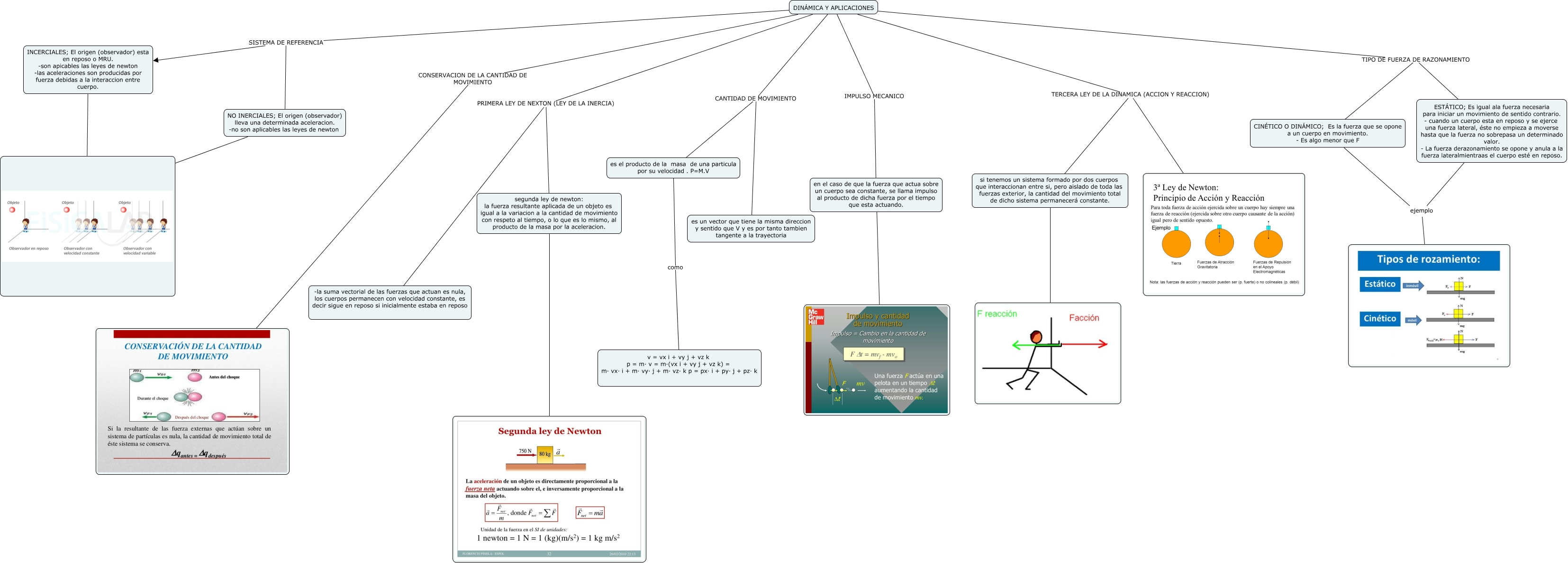 Este Cmap, tiene información relacionada con: trabajo de fisica mecanica, CINÉTICO O DINÁMICO; Es la fuerza que se opone a un cuerpo en movimiento. - Es algo menor que F ejemplo, INCERCIALES; El origen (observador) esta en reposo o MRU. -son apicables las leyes de newton -las aceleraciones son producidas por fuerza debidas a la interaccion entre cuerpo. ????, DINÁMICA Y APLICACIONES TERCERA LEY DE LA DINAMICA (ACCION Y REACCION), DINÁMICA Y APLICACIONES PRIMERA LEY DE NEXTON (LEY DE LA INERCIA) -la suma vectorial de las fuerzas que actuan es nula, los cuerpos permanecen con velocidad constante, es decir sigue en reposo si inicialmente estaba en reposo, DINÁMICA Y APLICACIONES CONSERVACION DE LA CANTIDAD DE MOVIMIENTO, DINÁMICA Y APLICACIONES CANTIDAD DE MOVIMIENTO es el producto de la masa de una particula por su velocidad . P=M.V, DINÁMICA Y APLICACIONES SISTEMA DE REFERENCIA INCERCIALES; El origen (observador) esta en reposo o MRU. -son apicables las leyes de newton -las aceleraciones son producidas por fuerza debidas a la interaccion entre cuerpo., DINÁMICA Y APLICACIONES IMPULSO MECANICO en el caso de que la fuerza que actua sobre un cuerpo sea constante, se llama impulso al producto de dicha fuerza por el tiempo que esta actuando., segunda ley de newton: la fuerza resultante aplicada de un objeto es igual a la variacion a la cantidad de movimiento con respeto al tiempo, o lo que es lo mismo, al producto de la masa por la aceleracion. ????, en el caso de que la fuerza que actua sobre un cuerpo sea constante, se llama impulso al producto de dicha fuerza por el tiempo que esta actuando. ????, DINÁMICA Y APLICACIONES TIPO DE FUERZA DE RAZONAMIENTO CINÉTICO O DINÁMICO; Es la fuerza que se opone a un cuerpo en movimiento. - Es algo menor que F, DINÁMICA Y APLICACIONES TERCERA LEY DE LA DINAMICA (ACCION Y REACCION) si tenemos un sistema formado por dos cuerpos que interaccionan entre si, pero aislado de toda las fuerzas exterior, la cantidad del movimiento total de dicho sistema permanecerá constante., ESTÁTICO; Es igual ala fuerza necesaria para iniciar un movimiento de sentido contrario. - cuando un cuerpo esta en reposo y se ejerce una fuerza lateral, éste no empieza a moverse hasta que la fuerza no sobrepasa un determinado valor. - La fuerza derazonamiento se opone y anula a la fuerza lateralmientraas el cuerpo esté en reposo. ejemplo, es el producto de la masa de una particula por su velocidad . P=M.V como v = vx i + vy j + vz k p = m· v = m·(vx i + vy j + vz k) = m· vx· i + m· vy· j + m· vz· k p = px· i + py· j + pz· k, si tenemos un sistema formado por dos cuerpos que interaccionan entre si, pero aislado de toda las fuerzas exterior, la cantidad del movimiento total de dicho sistema permanecerá constante. ????, DINÁMICA Y APLICACIONES TIPO DE FUERZA DE RAZONAMIENTO ESTÁTICO; Es igual ala fuerza necesaria para iniciar un movimiento de sentido contrario. - cuando un cuerpo esta en reposo y se ejerce una fuerza lateral, éste no empieza a moverse hasta que la fuerza no sobrepasa un determinado valor. - La fuerza derazonamiento se opone y anula a la fuerza lateralmientraas el cuerpo esté en reposo., DINÁMICA Y APLICACIONES SISTEMA DE REFERENCIA NO INERCIALES; El origen (observador) lleva una determinada aceleracion. -no son aplicables las leyes de newton, DINÁMICA Y APLICACIONES CANTIDAD DE MOVIMIENTO es un vector que tiene la misma direccion y sentido que V y es por tanto tambien tangente a la trayectoria, NO INERCIALES; El origen (observador) lleva una determinada aceleracion. -no son aplicables las leyes de newton ????, DINÁMICA Y APLICACIONES PRIMERA LEY DE NEXTON (LEY DE LA INERCIA) segunda ley de newton: la fuerza resultante aplicada de un objeto es igual a la variacion a la cantidad de movimiento con respeto al tiempo, o lo que es lo mismo, al producto de la masa por la aceleracion.