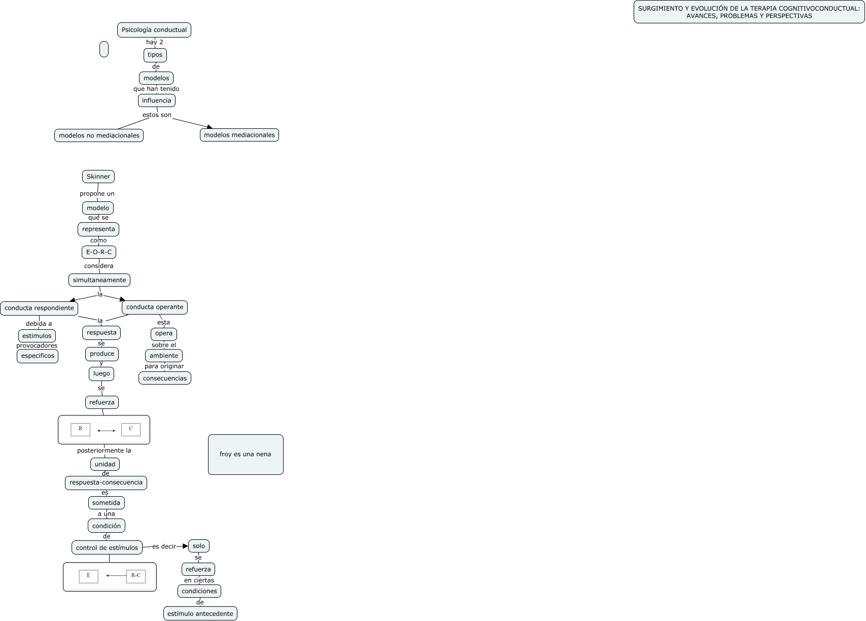 Este Cmap, tiene información relacionada con: Sin Título 2, Psicología conductual hay 2 tipos, refuerza en ciertas condiciones, conducta operante esta opera, luego se refuerza, condición de control de estímulos, E-O-R-C considera simultaneamente, tipos de modelos, respuesta se produce, opera sobre el ambiente, simultaneamente la conducta respondiente, respuesta-consecuencia es sometida, control de estímulos es decir solo, modelos que han tenido influencia, conducta operante la respuesta, influencia estos son modelos no mediacionales, estimulos provocadores especificos, representa como E-O-R-C, condiciones de estímulo antecedente, Skinner propone un modelo, sometida a una condición