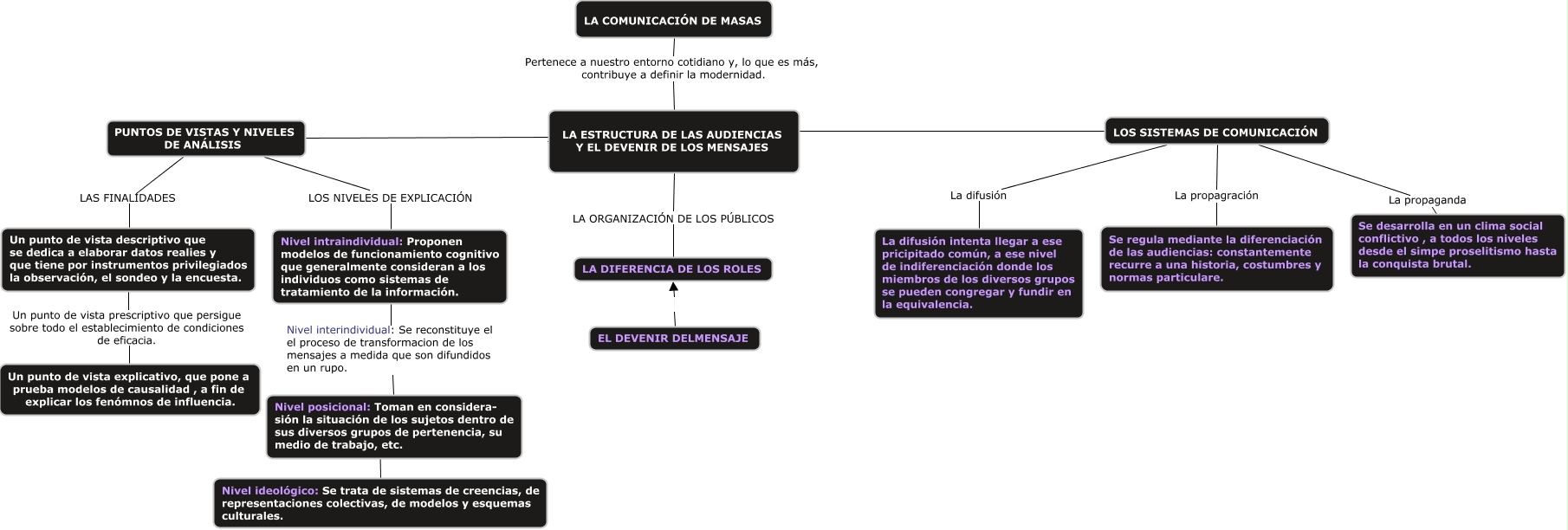 Este Cmap, tiene información relacionada con: Comunicación de masas, Nivel posicional: Toman en considera- sión la situación de los sujetos dentro de sus diversos grupos de pertenencia, su medio de trabajo, etc. ???? Nivel ideológico: Se trata de sistemas de creencias, de representaciones colectivas, de modelos y esquemas culturales., LA COMUNICACIÓN DE MASAS Pertenece a nuestro entorno cotidiano y, lo que es más, contribuye a definir la modernidad. LA ESTRUCTURA DE LAS AUDIENCIAS Y EL DEVENIR DE LOS MENSAJES, PUNTOS DE VISTAS Y NIVELES DE ANÁLISIS ???? LA ESTRUCTURA DE LAS AUDIENCIAS Y EL DEVENIR DE LOS MENSAJES, Un punto de vista descriptivo que se dedica a elaborar datos realies y que tiene por instrumentos privilegiados la observación, el sondeo y la encuesta. Un punto de vista prescriptivo que persigue sobre todo el establecimiento de condiciones de eficacia. Un punto de vista explicativo, que pone a prueba modelos de causalidad , a fin de explicar los fenómnos de influencia., EL DEVENIR DELMENSAJE LA DIFERENCIA DE LOS ROLES, LOS SISTEMAS DE COMUNICACIÓN La propaganda Se desarrolla en un clima social conflictivo , a todos los niveles desde el simpe proselitismo hasta la conquista brutal., LOS SISTEMAS DE COMUNICACIÓN La difusión La difusión intenta llegar a ese pricipitado común, a ese nivel de indiferenciación donde los miembros de los diversos grupos se pueden congregar y fundir en la equivalencia., PUNTOS DE VISTAS Y NIVELES DE ANÁLISIS LOS NIVELES DE EXPLICACIÓN Nivel intraindividual: Proponen modelos de funcionamiento cognitivo que generalmente consideran a los individuos como sistemas de tratamiento de la información., Nivel intraindividual: Proponen modelos de funcionamiento cognitivo que generalmente consideran a los individuos como sistemas de tratamiento de la información. Nivel interindividual: Se reconstituye el el proceso de transformacion de los mensajes a medida que son difundidos en un rupo. Nivel posicional: Toman en considera- sión la situación de los sujetos dentro de sus diversos grupos de pertenencia, su medio de trabajo, etc., LOS SISTEMAS DE COMUNICACIÓN ???? LA ESTRUCTURA DE LAS AUDIENCIAS Y EL DEVENIR DE LOS MENSAJES, PUNTOS DE VISTAS Y NIVELES DE ANÁLISIS LAS FINALIDADES Un punto de vista descriptivo que se dedica a elaborar datos realies y que tiene por instrumentos privilegiados la observación, el sondeo y la encuesta., LOS SISTEMAS DE COMUNICACIÓN La propagración Se regula mediante la diferenciación de las audiencias: constantemente recurre a una historia, costumbres y normas particulare., LA ESTRUCTURA DE LAS AUDIENCIAS Y EL DEVENIR DE LOS MENSAJES LA ORGANIZACIÓN DE LOS PÚBLICOS LA DIFERENCIA DE LOS ROLES
