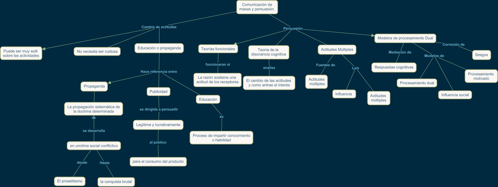 Este Cmap, tiene información relacionada con: Comunicación de masas y persuasión, Comunicación de masas y persuasión. Persuasión Modelos de procesamiento Dual, Educación es Proceso de impartir conocimiento o habilidad, Comunicación de masas y persuasión. Cambio de actitudes Educación o propaganda, Comunicación de masas y persuasión. Persuasión Teoría de la disonancia cognitiva, Modelos de procesamiento Dual Mediación de Respuestas cognitivas, Modelos de procesamiento Dual Correción de Sesgos, Teorías funcionales funcionaran si La razón sostiene una actitud de los receptores, Modelos de procesamiento Dual Modelos de Procesamiento dual, Legítima y lucrativamente al público para el consumo del producto, en unclima social conflictivo desde El proselitismo, Teoría de la disonancia cognitiva analiza El cambio de las actitudes y como antrae el interés, Comunicación de masas y persuasión. Persuasión Teorías funcionales, La propagación sistemática de la doctrina determinada se desarrolla en unclima social conflictivo, Comunicación de masas y persuasión. Persuasión Actitudes Múltiples, Comunicación de masas y persuasión. Cambio de actitudes Puede ser muy sutil sobre las actividades, Educación o propaganda Hace referencia entre Publicidad, Publicidad es dirigida a persuadir Legítima y lucrativamente, Actitudes Múltiples La/s Actitudes múltiples, en unclima social conflictivo Hasta la conquista brutal, Actitudes Múltiples La/s Influencia