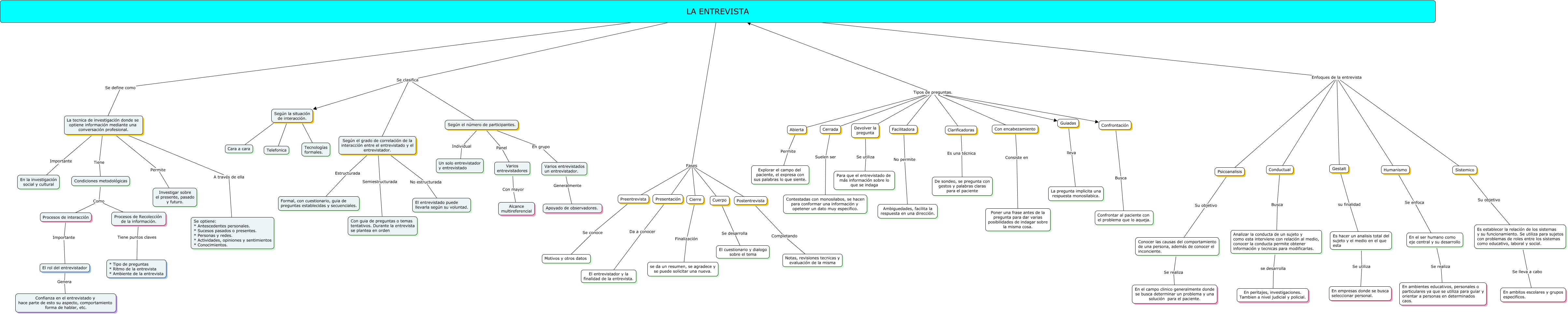 Este Cmap, tiene información relacionada con: La entrevista, Sistemico Su objetivo Es establecer la relación de los sistemas y su funcionamiento. Se utiliza para sujetos con problemas de roles entre los sistemas como educativo, laboral y social., Es establecer la relación de los sistemas y su funcionamiento. Se utiliza para sujetos con problemas de roles entre los sistemas como educativo, laboral y social. Se lleva a cabo En ambitos escolares y grupos especificos., La tecnica de investigación donde se optiene información mediante una conversación profesional. Tiene Condiciones metodológicas, Confrontación Busca Confrontar al paciente con el problema que lo aqueja., Abierta Tipos de preguntas. LA ENTREVISTA, Abierta Tipos de preguntas. Clarificadoras, LA ENTREVISTA Fases Preentrevista, LA ENTREVISTA Fases Postentrevista, Varios entrevistados un entrevistador. Generalmente Apoyado de observadores., Devolver la pregunta Se utiliza Para que el entrevistado de más información sobre lo que se indaga, Abierta Tipos de preguntas. Facilitadora, Condiciones metodológicas Como Procesos de interacción, LA ENTREVISTA Fases Cuerpo, Según la situación de interacción. ???? Cara a cara, Procesos de Recolección de la información. Tiene puntos claves * Tipo de preguntas * Ritmo de la entrevista * Ambiente de la entrevista, Según la situación de interacción. ???? Tecnologías formales., Abierta Tipos de preguntas. Cerrada, LA ENTREVISTA Fases Presentación, LA ENTREVISTA Se clasifica Según el grado de correlación de la interacción entre el entrevistado y el entrevistador., Cierre Finalización se da un resumen, se agradece y se puede solicitar una nueva.