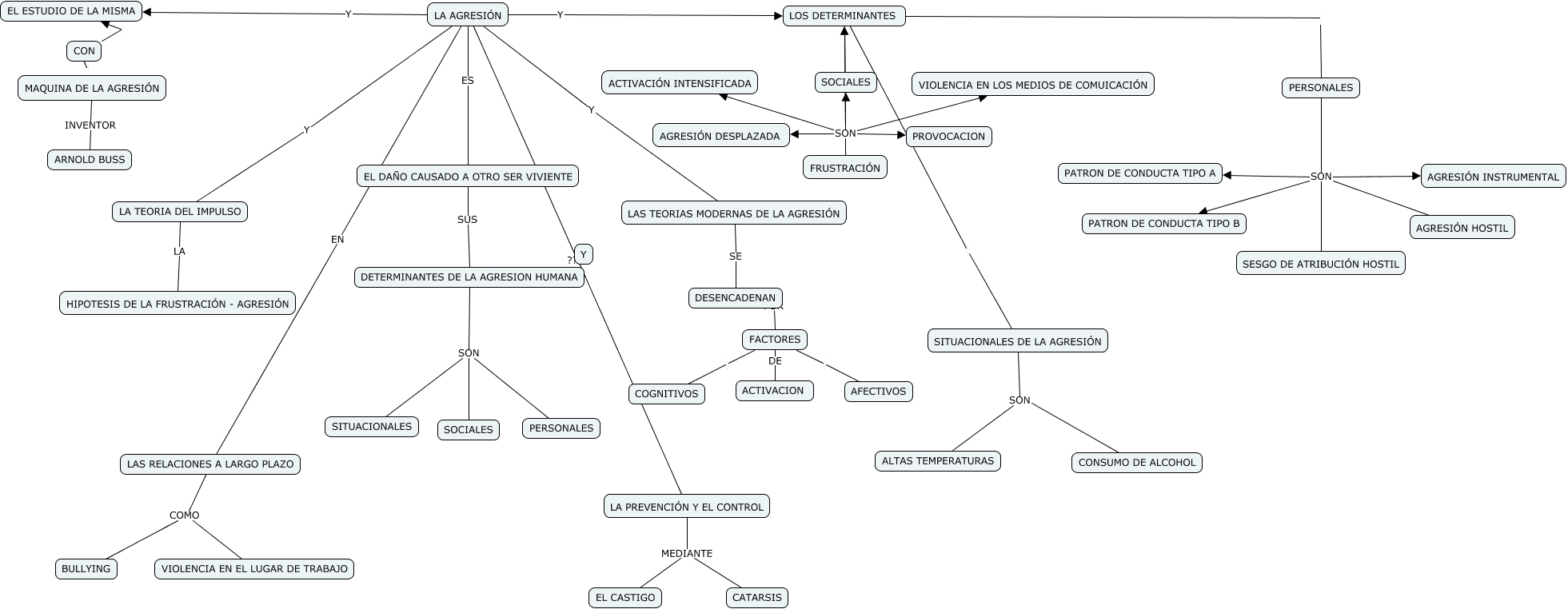 Este Cmap, tiene información relacionada con: LA AGRESIÓN, LOS DETERMINANTES SON ACTIVACIÓN INTENSIFICADA, LA AGRESIÓN Y LAS TEORIAS MODERNAS DE LA AGRESIÓN, CON EL ESTUDIO DE LA MISMA, DETERMINANTES DE LA AGRESION HUMANA SON SITUACIONALES, SITUACIONALES DE LA AGRESIÓN SON ALTAS TEMPERATURAS, PERSONALES SON PATRON DE CONDUCTA TIPO B, LA AGRESIÓN ???? LA PREVENCIÓN Y EL CONTROL, FACTORES COGNITIVOS, LA AGRESIÓN Y LOS DETERMINANTES, LOS DETERMINANTES SON SOCIALES, LOS DETERMINANTES SON PROVOCACION, CON MAQUINA DE LA AGRESIÓN, DESENCADENAN POR FACTORES, LA AGRESIÓN ES EL DAÑO CAUSADO A OTRO SER VIVIENTE, LAS TEORIAS MODERNAS DE LA AGRESIÓN SE DESENCADENAN, LAS RELACIONES A LARGO PLAZO COMO BULLYING, LA TEORIA DEL IMPULSO LA HIPOTESIS DE LA FRUSTRACIÓN - AGRESIÓN, LA PREVENCIÓN Y EL CONTROL MEDIANTE CATARSIS, LA AGRESIÓN EN LAS RELACIONES A LARGO PLAZO, PERSONALES SON PATRON DE CONDUCTA TIPO A