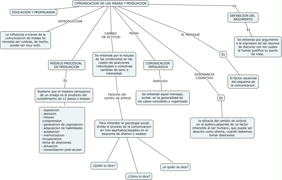 Este Cmap, tiene información relacionada con: comunicacion de masas y persuacion, Se entiende por el estudio de las condiciones en las cuales las posiciones individuales o colectivas cambian de seno e intensidad. Factores del cambio de actitud Para entender la psicologia social divide el proceso de la comunicacion en tres apartados,basados en el esquema de shanon y weaber, COMUNICACION DE LAS MASAS Y PERSUACION INTRODUCCION La influencia a traves de la comunicacion de masas no necesita ser ruidosa, de hecho, puede ser muy sutil., COMUNICACION PERSUASIVA Definición Se entiende aquel mensaje, verbal. en la generalidad de los casos-concebido y organizado, Para entender la psicologia social divide el proceso de la comunicacion en tres apartados,basados en el esquema de shanon y weaber ¿A quién se dice?, Sostiene que el impacto persuacivo de un ensaje es el producto del cumplimiento de 12 pasos o etapas: - exposicion - atension - interes -comprension - generacion de cognizacion - adquisicion de habilidades - aceptacion - memorizacion -recuperacion -toma de desiciones - actuacion - consolidacion post-accion, COMUNICACION DE LAS MASAS Y PERSUACION MODELO PROCESUAL DE PERSUACION, COMUNICACION DE LAS MASAS Y PERSUACION ???? EDUCACION Y PROPAGANDA, Es ???? El factor escencial del esquema de la comunicacion., DEFINICION DEL ARGUMENTO Es Se entiende por argumento a la expresion de las razones de discurso con los cuales la fuente justifica su punto de vista., COMUNICACION DE LAS MASAS Y PERSUACION La DEFINICION DEL ARGUMENTO, COMUNICACION DE LAS MASAS Y PERSUACION EL MENSAJE Es, COMUNICACION DE LAS MASAS Y PERSUACION DISONANCIA COGNITIVA Es, Para entender la psicologia social divide el proceso de la comunicacion en tres apartados,basados en el esquema de shanon y weaber ¿Quién lo dice?, COMUNICACION DE LAS MASAS Y PERSUACION Partes COMUNICACION PERSUASIVA, MODELO PROCESUAL DE PERSUACION Es Sostiene que el impacto persuacivo de un ensaje es el producto del cumplimiento de 12 pasos o etapas:, Es ???? la eficacia del cambio de actitud en el publico,depende de un factor inherente al ser humano, que puede ser descrito como dilema, cuando debemos tomar desiciones., Para entender la psicologia social divide el proceso de la comunicacion en tres apartados,basados en el esquema de shanon y weaber ¿Cómo lo dice?, COMUNICACION DE LAS MASAS Y PERSUACION CAMBIO DE ACTITUD Se entiende por el estudio de las condiciones en las cuales las posiciones individuales o colectivas cambian de seno e intensidad.