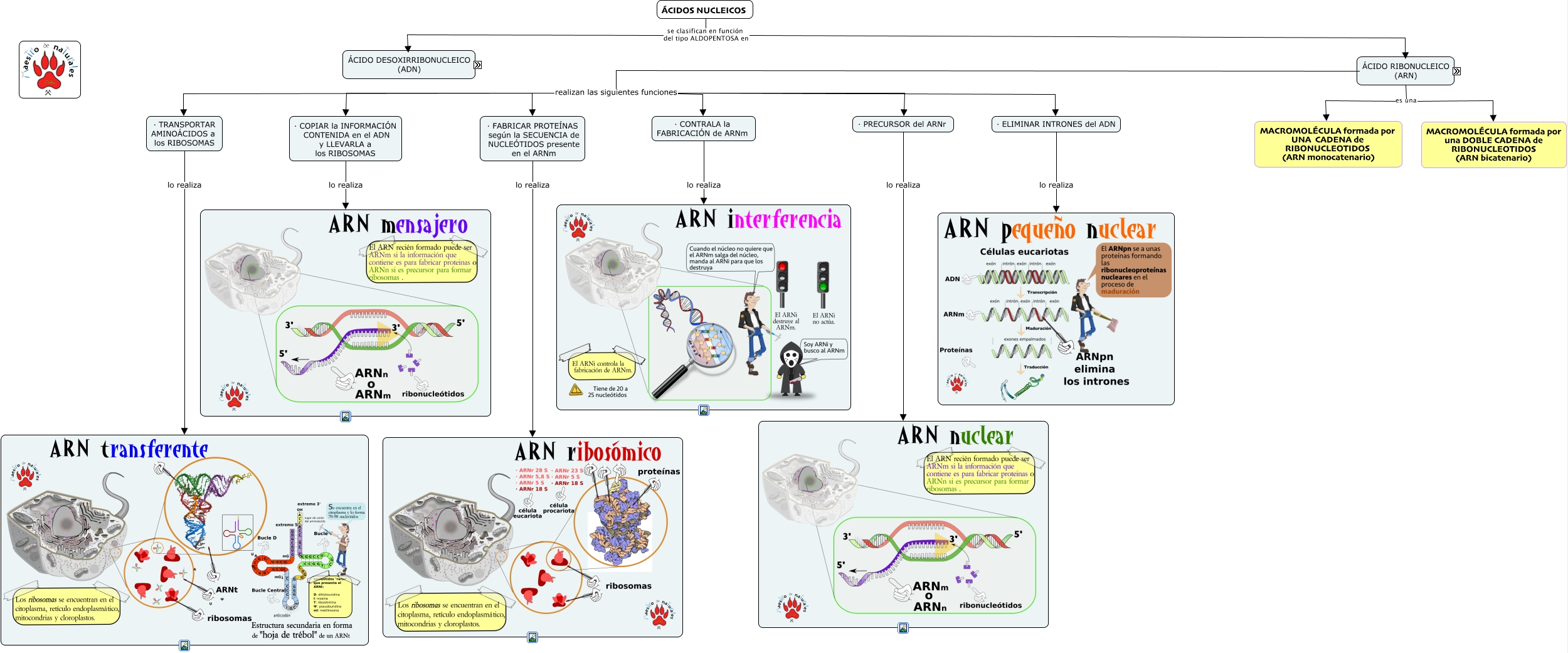 Este Cmap, tiene información relacionada con: 5.4 y 5.5 ARN, · TRANSPORTAR AMINOÁCIDOS a los RIBOSOMAS lo realiza, UNA CADENA de DESOXIRRIBONUCLEOTIDOS (ADN monocatenario) cuya función es ALMACENAR la INFORMACIÓN GENÉTICA, ÁCIDO RIBONUCLEICO (ARN) es una DOBLE CADENA de RIBONUCLEOTIDOS (ARN bicatenario), una DOBLE CADENA de DESOXIRRIBONUCLEOTIDOS (ADN bicatenario) cuya función es ALMACENAR la INFORMACIÓN GENÉTICA, ÁCIDO RIBONUCLEICO (ARN) realizan las siguientes funciones · FABRICAR PROTEÍNAS según la SECUENCIA de NUCLEÓTIDOS presente en el ARNm, se caracteriza por · FORMAR 1 HÉLICE · CADENAS ANTIPARALELAS (= disposición paralela y sentido opuestos) · BASES COMPLEMENTARIAS (A=T y G≡C), una DOBLE CADENA de DESOXIRRIBONUCLEOTIDOS (ADN bicatenario) distinguimos dos tipos en función de su forma, · COPIAR la INFORMACIÓN CONTENIDA en el ADN y LLEVARLA a los RIBOSOMAS lo realiza, una DOBLE CADENA de RIBONUCLEOTIDOS (ARN bicatenario) distinguimos dos tipos en función de su forma ????, UNA CADENA de DESOXIRRIBONUCLEOTIDOS (ADN monocatenario) distinguimos dos tipos en función de su forma, ÁCIDO RIBONUCLEICO (ARN) es una MACROMOLÉCULA formada por UNA CADENA de RIBONUCLEOTIDOS (ARN monocatenario), ÁCIDO RIBONUCLEICO (ARN) realizan las siguientes funciones · ELIMINAR INTRONES del ADN, UNA CADENA de RIBONUCLEOTIDOS (ARN monocatenario) distinguimos dos tipos en función de su forma, ÁCIDO RIBONUCLEICO (ARN) realizan las siguientes funciones · COPIAR la INFORMACIÓN CONTENIDA en el ADN y LLEVARLA a los RIBOSOMAS, ÁCIDOS NUCLEICOS se clasifican en función del tipo ALDOPENTOSA en ÁCIDO DESOXIRRIBONUCLEICO (ADN), ÁCIDO RIBONUCLEICO (ARN) realizan las siguientes funciones · CONTRALA la FABRICACIÓN de ARNm, se caracteriza por · FORMAR 1 DOBLE HÉLICE · CADENAS ANTIPARALELAS (= disposición paralela y sentido opuestos) · BASES COMPLEMENTARIAS (A=T y G≡C), se caracteriza por · FORMAR 1 DOBLE HÉLICE · CADENAS ANTIPARALELAS (= disposición paralela y sentido opuestos) · BASES COMPLEMENTARIAS (A=U y G≡C), se caracteriza por · FORMAR 1 HÉLICE · CADENAS ANTIPARALELAS (= disposición paralela y sentido opuestos) · BASES COMPLEMENTARIAS (A=T y G≡C), ÁCIDO RIBONUCLEICO (ARN) es una MACROMOLÉCULA formada por una DOBLE CADENA de RIBONUCLEOTIDOS (ARN bicatenario)