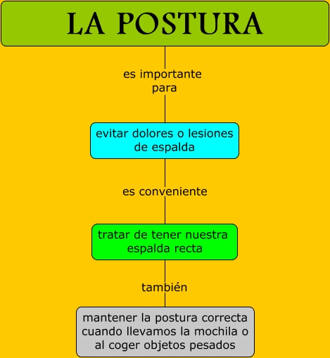 Este Cmap, tiene información relacionada con: La postura, evitar dolores o lesiones de espalda es conveniente tratar de tener nuestra espalda recta, tratar de tener nuestra espalda recta también mantener la postura correcta cuando llevamos la mochila o al coger objetos pesados, LA POSTURA es importante para evitar dolores o lesiones de espalda