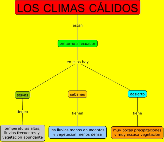 Este Cmap, tiene información relacionada con: Los climas cálidos, en torno al ecuador en ellos hay sabanas, sabanas tienen las lluvias menos abundantes y vegetación menos densa, desierto tiene muy pocas precipitaciones y muy escasa vegetación, LOS CLIMAS CÁLIDOS están en torno al ecuador, selvas tienen temperaturas altas, lluvias frecuentes y vegetación abundante, en torno al ecuador en ellos hay selvas, en torno al ecuador en ellos hay desierto