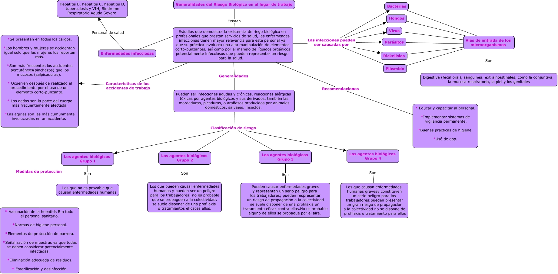 Este Cmap, tiene información relacionada con: Riesgos biologicos en el lugar de trabajo, Pueden ser infecciones agudas y crónicas, reacciones alérgicas tóxicas por agentes biológicos y sus derivados, también las mordeduras, picaduras, o arañasos producidos por animales domésticos, salvajes, insectos. Clasificación de riesgo Los agentes biológicos Grupo 2, Estudios que demuestra la existencia de riego biológico en profesionales que prestan servicios de salud, las enfermeades infeccionas tienen mayor relevancia para esté personal ya que su práctica involucra una alta manipulación de elementos corto-punzantes, así como por el manejo de líquidos orgánicos potencialmente infecciosos que pueden representar un riesgo para la salud. Generalidades Pueden ser infecciones agudas y crónicas, reacciones alérgicas tóxicas por agentes biológicos y sus derivados, también las mordeduras, picaduras, o arañasos producidos por animales domésticos, salvajes, insectos., Estudios que demuestra la existencia de riego biológico en profesionales que prestan servicios de salud, las enfermeades infeccionas tienen mayor relevancia para esté personal ya que su práctica involucra una alta manipulación de elementos corto-punzantes, así como por el manejo de líquidos orgánicos potencialmente infecciosos que pueden representar un riesgo para la salud. Las infecciones pueden ser causadas por Rickellsias, Estudios que demuestra la existencia de riego biológico en profesionales que prestan servicios de salud, las enfermeades infeccionas tienen mayor relevancia para esté personal ya que su práctica involucra una alta manipulación de elementos corto-punzantes, así como por el manejo de líquidos orgánicos potencialmente infecciosos que pueden representar un riesgo para la salud. Las infecciones pueden ser causadas por Parásitos, Estudios que demuestra la existencia de riego biológico en profesionales que prestan servicios de salud, las enfermeades infeccionas tienen mayor relevancia para esté personal ya que su práctica involucra una alta manipulación de elementos corto-punzantes, así como por el manejo de líquidos orgánicos potencialmente infecciosos que pueden representar un riesgo para la salud. Las infecciones pueden ser causadas por Bacterias, Pueden ser infecciones agudas y crónicas, reacciones alérgicas tóxicas por agentes biológicos y sus derivados, también las mordeduras, picaduras, o arañasos producidos por animales domésticos, salvajes, insectos. Clasificación de riesgo Los agentes biológicos Grupo 1, Bacterias ???? Vías de entrada de los microorganismos, Estudios que demuestra la existencia de riego biológico en profesionales que prestan servicios de salud, las enfermeades infeccionas tienen mayor relevancia para esté personal ya que su práctica involucra una alta manipulación de elementos corto-punzantes, así como por el manejo de líquidos orgánicos potencialmente infecciosos que pueden representar un riesgo para la salud. Las infecciones pueden ser causadas por Plásmido, Estudios que demuestra la existencia de riego biológico en profesionales que prestan servicios de salud, las enfermeades infeccionas tienen mayor relevancia para esté personal ya que su práctica involucra una alta manipulación de elementos corto-punzantes, así como por el manejo de líquidos orgánicos potencialmente infecciosos que pueden representar un riesgo para la salud. Las infecciones pueden ser causadas por Virus, Estudios que demuestra la existencia de riego biológico en profesionales que prestan servicios de salud, las enfermeades infeccionas tienen mayor relevancia para esté personal ya que su práctica involucra una alta manipulación de elementos corto-punzantes, así como por el manejo de líquidos orgánicos potencialmente infecciosos que pueden representar un riesgo para la salud. Las infecciones pueden ser causadas por Hongos, Pueden ser infecciones agudas y crónicas, reacciones alérgicas tóxicas por agentes biológicos y sus derivados, también las mordeduras, picaduras, o arañasos producidos por animales domésticos, salvajes, insectos. Clasificación de riesgo Los agentes biológicos Grupo 4, Los agentes biológicos Grupo 4 Son Los que causan enfermedades humanas gravesy constituyen un serio peligro para los trabajadores;pueden presentar un gran riesgo de propagación a la colectividad no se dispone de profilaxis o tratamiento para ellos, Estudios que demuestra la existencia de riego biológico en profesionales que prestan servicios de salud, las enfermeades infeccionas tienen mayor relevancia para esté personal ya que su práctica involucra una alta manipulación de elementos corto-punzantes, así como por el manejo de líquidos orgánicos potencialmente infecciosos que pueden representar un riesgo para la salud. Recomendaciones * Educar y capacitar al personal. *Implementar sistemas de vigilancia permanente. *Buenas practicas de higiene. *Usó de epp., Estudios que demuestra la existencia de riego biológico en profesionales que prestan servicios de salud, las enfermeades infeccionas tienen mayor relevancia para esté personal ya que su práctica involucra una alta manipulación de elementos corto-punzantes, así como por el manejo de líquidos orgánicos potencialmente infecciosos que pueden representar un riesgo para la salud. ???? Enfermedades infecciosas, Hongos ???? Vías de entrada de los microorganismos, Los agentes biológicos Grupo 3 Son Pueden causar enfermedades graves y representan un serio peligro para los trabajadores; pueden respresentar un riesgo de propagación a la colectividad se suele disponer de una profilaxis un tratamiento eficaz contra ellos.No es probable alguno de ellos se propague por el aire., Parásitos ???? Vías de entrada de los microorganismos, Estudios que demuestra la existencia de riego biológico en profesionales que prestan servicios de salud, las enfermeades infeccionas tienen mayor relevancia para esté persona