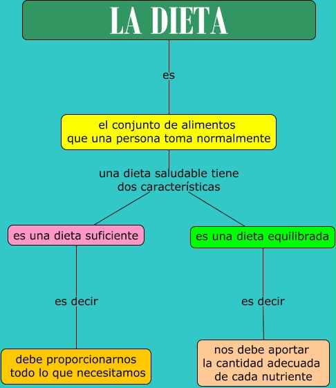 Este Cmap, tiene información relacionada con: La dieta, el conjunto de alimentos que una persona toma normalmente una dieta saludable tiene dos características es una dieta suficiente, es una dieta equilibrada es decir nos debe aportar la cantidad adecuada de cada nutriente, LA DIETA es el conjunto de alimentos que una persona toma normalmente, es una dieta suficiente es decir debe proporcionarnos todo lo que necesitamos, el conjunto de alimentos que una persona toma normalmente una dieta saludable tiene dos características es una dieta equilibrada