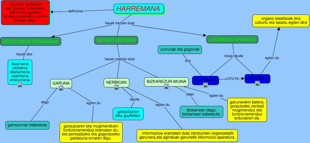 This Concept Map, created with IHMC CmapTools, has information related to: HARREMANA-LAIA, HEZURRAK LOTUTA GIHARRAK, HARREMANA hauek hartzen dute NERBIO-SISTEMA, GARUNA egiten du gorputzaren eta mugimenduen funtzionamendua eramaten du, eta pentsatzeko eta gogoratzeko gaitasuna ematen digu., GARUNA dago garrezurran babestuta, BIZKAREZUR-MUINA dago bizkarrean dago, bizkarrean babestuta., HARREMANA hauek hartzen dute LOKOMOZIO-APARATUA, ZENTZUMEN-ORGANOAK hauek dira ikusmena ukimena daztamena usaimena entzumena, NERBIOAK daude gorputzaren leku guztietan., NERBIOAK egiten du informazioa eramaten dute zentzumen-organoetatik garunera,eta aginduak garunetik lokomozio-aparatura., HARREMANA hauek hartzen dute ZENTZUMEN-ORGANOAK, LOKOMOZIO-APARATUA lotuta daude HEZURRAK, HARREMANA definizioa inguruan gertatzen den guztiaz ohartzeko eta modu egokian erreakzionatzeko aukera ematen digu., GIHARRAK egiten du organo elastikoak dira uzkurtu eta lasaitu egiten dira, NERBIO-SISTEMA hauek osatzen dute BIZKAREZUR-MUINA, BIZKAREZUR-MUINA egiten du garunarekin batera, gorputzeko zenbait mugimenduz eta funtzionamenduz arduratzen da., LOKOMOZIO-APARATUA lotuta daude GIHARRAK, zurrunak eta gogorrak dira HEZURRAK, NERBIO-SISTEMA hauek osatzen dute NERBIOAK, NERBIO-SISTEMA hauek osatzen dute GARUNA