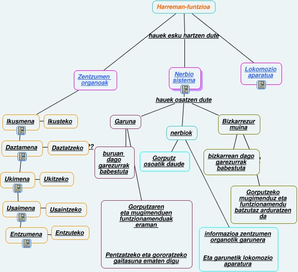 This Concept Map, created with IHMC CmapTools, has information related to: Harremana-Maialen, Ikusmena ???? Ikusteko, Bizkarrezur muina ???? Gorputzeko mugimenduz eta funtzionamendu batzutaz arduratzen da, Harreman-funtzioa ???? Zentzumen organoak, Zentzumen organoak ???? Ikusmena, Usaimena ???? Usaintzeko, nerbiok ???? informazioa zentzumen organotik garunera Eta garunetik lokomozio aparatura, Garuna ???? buruan dago garezurrak babestuta, Nerbio sistema hauek osatzen dute Garuna, Ukimena ???? Ukitzeko, Bizkarrezur muina ???? bizkarrean dago garezurrak babestuta, nerbiok ???? Gorputz osoatik daude, Ikusmena ???? Daztamena, Entzumena ???? Entzuteko, Daztamena ???? Daztatzeko, Harreman-funtzioa ???? Lokomozio aparatua, Ukimena ???? Usaimena, Usaimena ???? Entzumena, Daztamena ???? Ukimena, Garuna ???? Gorputzaren eta mugimenduen funtzionamenduak eraman Pentzatzeko eta gororatzeko gaitasuna ematen digu, Harreman-funtzioa hauek esku hartzen dute Nerbio sistema