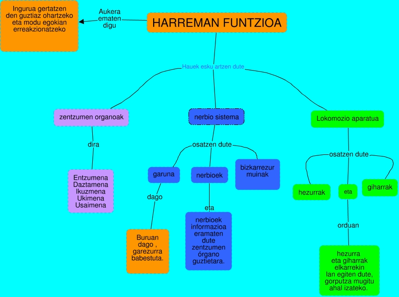 This Concept Map, created with IHMC CmapTools, has information related to: harremana-Iriaperez, HARREMAN FUNTZIOA Hauek esku artzen dute nerbio sistema, Lokomozio aparatua osatzen dute hezurrak, zentzumen organoak dira Entzumena Daztamena Ikuzmena Ukimena Usaimena, nerbio sistema osatzen dute nerbioek, Lokomozio aparatua osatzen dute giharrak, HARREMAN FUNTZIOA Hauek esku artzen dute zentzumen organoak, nerbio sistema osatzen dute bizkarrezur muinak, HARREMAN FUNTZIOA Aukera ematen digu Ingurua gertatzen den guztiaz ohartzeko eta modu egokian erreakzionatzeko, Lokomozio aparatua osatzen dute eta, garuna dago Buruan dago , garezurra babestuta., eta orduan hezurra eta giharrak elkarrekin lan egiten dute, gorputza mugitu ahal izateko., nerbioek eta nerbioek informazioa eramaten dute zentzumen órgano guztietara., HARREMAN FUNTZIOA Hauek esku artzen dute Lokomozio aparatua, nerbio sistema osatzen dute garuna