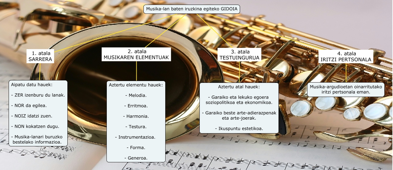 Este Cmap, tiene información relacionada con: Gidoia, Musika-lan baten iruzkina egiteko GIDOIA 4. atala IRITZI PERTSONALA Musika-argudioetan oinarritutako iritzi pertsonala eman., Musika-lan baten iruzkina egiteko GIDOIA 1. atala SARRERA Aipatu datu hauek: - ZER izenburu du lanak. - NOR da egilea. - NOIZ idatzi zuen. - NON kokatzen dugu. - Musika-lanari buruzko bestelako informazioa., Musika-lan baten iruzkina egiteko GIDOIA 2. atala MUSIKAREN ELEMENTUAK Aztertu elementu hauek: - Melodia. - Erritmoa. - Harmonia. - Testura. - Instrumentazioa. - Forma. - Generoa., Musika-lan baten iruzkina egiteko GIDOIA 3. atala TESTUINGURUA Aztertu atal hauek: - Garaiko eta lekuko egoera soziopolitikoa eta ekonomikoa. - Garaiko beste arte-adierazpenak eta arte-joerak. - Ikuspuntu estetikoa.
