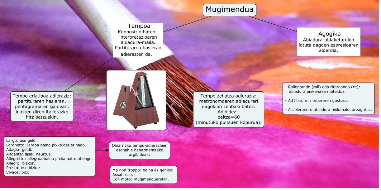 Este Cmap, tiene información relacionada con: mugimendua, Mugimendua Agogika Abiadura-aldaketarekin lotuta dagoen espresioaren alderdia. - Rallentando (rall) edo ritardando (rit): abiadura pixkanaka motelduz. - Ad libitum: norberaren gustura. - Accelerando: abiadura pixkanaka areagotuz., Oinarrizko tempo-adierazleen esanahia ñabarmentzeko argibideak: Ma non troppo: baina ez gehiegi. Assai: oso. Con moto: mugimenduarekin., Mugimendua Tempoa Konposizio baten interpretazioaren abiadura-maila. Partituraren hasieran adierazten da. Tempo zehatza adieraziz: metronomoaren abiadurari dagokion zenbaki batez. Adibidez: beltza=60 (minutuko pultsuen kopurua)., Tempo erlatiboa adieraziz: partituraren hasieran, pentagramaren gainean, idazten diren italierazko hitz batzuekin. Largo: oso geldi. Larghetto: largoa baino pixka bat arinago. Adagio: geldi. Andante: lasai, neurtua. Allegretto: allegroa baino pixka bat motelago. Allegro: bizkor. Presto: oso bizkor. Vivace: bizi., Largo: oso geldi. Larghetto: largoa baino pixka bat arinago. Adagio: geldi. Andante: lasai, neurtua. Allegretto: allegroa baino pixka bat motelago. Allegro: bizkor. Presto: oso bizkor. Vivace: bizi. ???? Oinarrizko tempo-adierazleen esanahia ñabarmentzeko argibideak:, Mugimendua Tempoa Konposizio baten interpretazioaren abiadura-maila. Partituraren hasieran adierazten da. Tempo erlatiboa adieraziz: partituraren hasieran, pentagramaren gainean, idazten diren italierazko hitz batzuekin.