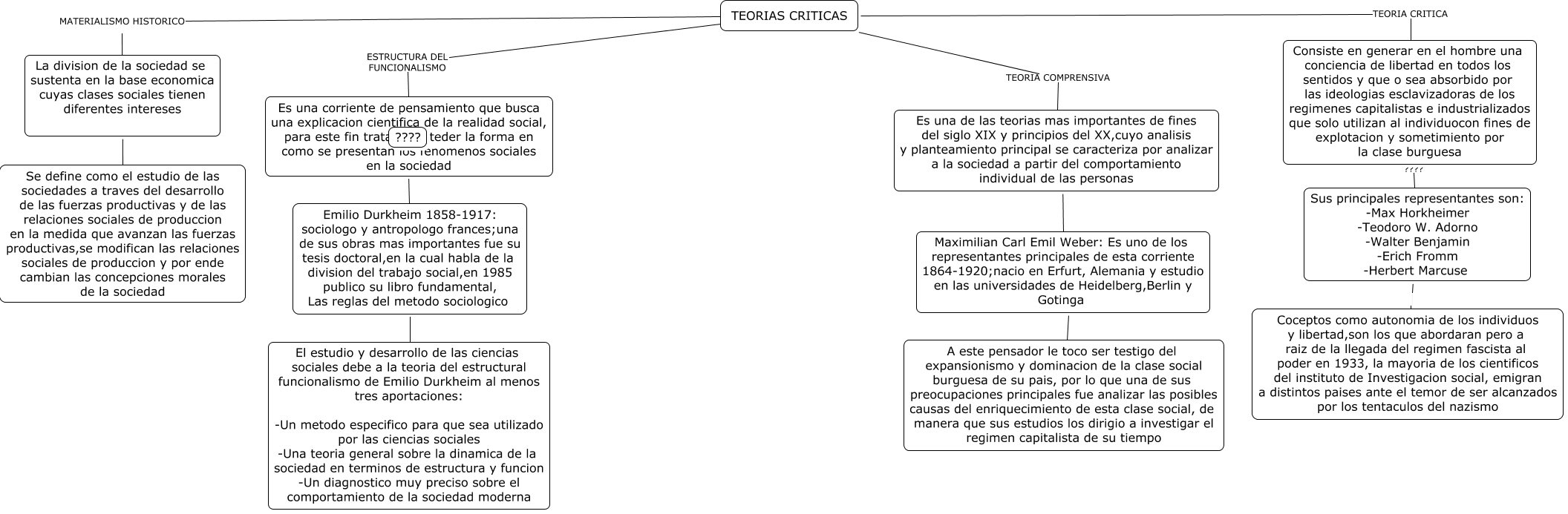 This Concept Map, created with IHMC CmapTools, has information related to: Teorias Criticas, Emilio Durkheim 1858-1917: sociologo y antropologo frances;una de sus obras mas importantes fue su tesis doctoral,en la cual habla de la division del trabajo social,en 1985 publico su libro fundamental, Las reglas del metodo sociologico ???? ????, TEORIAS CRITICAS TEORIA COMPRENSIVA Es una de las teorias mas importantes de fines del siglo XIX y principios del XX,cuyo analisis y planteamiento principal se caracteriza por analizar a la sociedad a partir del comportamiento individual de las personas, Maximilian Carl Emil Weber: Es uno de los representantes principales de esta corriente 1864-1920;nacio en Erfurt, Alemania y estudio en las universidades de Heidelberg,Berlin y Gotinga ???? A este pensador le toco ser testigo del expansionismo y dominacion de la clase social burguesa de su pais, por lo que una de sus preocupaciones principales fue analizar las posibles causas del enriquecimiento de esta clase social, de manera que sus estudios los dirigio a investigar el regimen capitalista de su tiempo, Consiste en generar en el hombre una conciencia de libertad en todos los sentidos y que o sea absorbido por las ideologias esclavizadoras de los regimenes capitalistas e industrializados que solo utilizan al individuocon fines de explotacion y sometimiento por la clase burguesa ???? Sus principales representantes son: -Max Horkheimer -Teodoro W. Adorno -Walter Benjamin -Erich Fromm -Herbert Marcuse, Sus principales representantes son: -Max Horkheimer -Teodoro W. Adorno -Walter Benjamin -Erich Fromm -Herbert Marcuse Coceptos como autonomia de los individuos y libertad,son los que abordaran pero a raiz de la llegada del regimen fascista al poder en 1933, la mayoria de los cientificos del instituto de Investigacion social, emigran a distintos paises ante el temor de ser alcanzados por los tentaculos del nazismo, Es una de las teorias mas importantes de fines del siglo XIX y principios del XX,cuyo analisis y planteamiento principal se caracteriza por analizar a la sociedad a partir del comportamiento individual de las personas ???? Maximilian Carl Emil Weber: Es uno de los representantes principales de esta corriente 1864-1920;nacio en Erfurt, Alemania y estudio en las universidades de Heidelberg,Berlin y Gotinga, TEORIAS CRITICAS TEORIA CRITICA Consiste en generar en el hombre una conciencia de libertad en todos los sentidos y que o sea absorbido por las ideologias esclavizadoras de los regimenes capitalistas e industrializados que solo utilizan al individuocon fines de explotacion y sometimiento por la clase burguesa, Emilio Durkheim 1858-1917: sociologo y antropologo frances;una de sus obras mas importantes fue su tesis doctoral,en la cual habla de la division del trabajo social,en 1985 publico su libro fundamental, Las reglas del metodo sociologico ???? El estudio y desarrollo de las ciencias sociales debe a la teoria del estructural funcionalismo de Emilio Durkheim al menos tres aportaciones: -Un metodo especifico para que sea utilizado por las ciencias sociales -Una teoria general sobre la dinamica de la sociedad en terminos de estructura y funcion -Un diagnostico muy preciso sobre el comportamiento de la sociedad moderna, TEORIAS CRITICAS MATERIALISMO HISTORICO Se define como el estudio de las sociedades a traves del desarrollo de las fuerzas productivas y de las relaciones sociales de produccion en la medida que avanzan las fuerzas productivas,se modifican las relaciones sociales de produccion y por ende cambian las concepciones morales de la sociedad, TEORIAS CRITICAS ESTRUCTURA DEL FUNCIONALISMO Es una corriente de pensamiento que busca una explicacion cientifica de la realidad social, para este fin trata de enteder la forma en como se presentan los fenomenos sociales en la sociedad