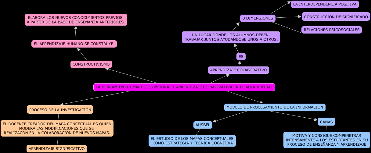 Este Cmap, tiene información relacionada con: AULA VIRTUAL CON CMAPTOOLS, LA HERRAMIENTA CMAPTOOLS MEJORA EL APRENDIZAJE COLABORATIVA EN EL AULA VIRTUAL ???? PROCESO DE LA INVESTIGACIÓN, EL DOCENTE CREADOR DEL MAPA CONCEPTUAL ES QUIEN MODERA LAS MODIFICACIONES QUE SE REALIZACON EN LA COLABORACION DE NUEVOS MAPAS. ???? APRENDIZAJE SIGNIFICATIVO, UN LUGAR DONDE LOS ALUMNOS DEBEN TRABAJAR JUNTOS AYUDANDOSE UNOS A OTROS. ???? 3 DIMENSIONES, LA HERRAMIENTA CMAPTOOLS MEJORA EL APRENDIZAJE COLABORATIVA EN EL AULA VIRTUAL ???? CONSTRUCTIVISMO, ES ???? UN LUGAR DONDE LOS ALUMNOS DEBEN TRABAJAR JUNTOS AYUDANDOSE UNOS A OTROS., EL APRENDIZAJE HUMANO SE CONSTRUYE ???? ELABORA LOS NUEVOS CONOCIMIENTOS PREVIOS A PARTIR DE LA BASE DE ENSEÑANZA ANTERIORES., MODELO DE PROCESAMIENTO DE LA INFORMACION ???? AUSBEL, APRENDIZAJE COLABORATIVO ???? ES, LA HERRAMIENTA CMAPTOOLS MEJORA EL APRENDIZAJE COLABORATIVA EN EL AULA VIRTUAL ???? MODELO DE PROCESAMIENTO DE LA INFORMACION, MODELO DE PROCESAMIENTO DE LA INFORMACION ???? CAÑAS, 3 DIMENSIONES ???? LA INTERDEPENDENCIA POSITIVA, PROCESO DE LA INVESTIGACIÓN ???? EL DOCENTE CREADOR DEL MAPA CONCEPTUAL ES QUIEN MODERA LAS MODIFICACIONES QUE SE REALIZACON EN LA COLABORACION DE NUEVOS MAPAS., CONSTRUCTIVISMO ???? EL APRENDIZAJE HUMANO SE CONSTRUYE, LA HERRAMIENTA CMAPTOOLS MEJORA EL APRENDIZAJE COLABORATIVA EN EL AULA VIRTUAL ???? APRENDIZAJE COLABORATIVO, CAÑAS ???? MOTIVA Y CONSIGUE COMPENETRAR INTENSAMENTE A LOS ESTUDIANTES EN SU PROCESO DE ENSEÑANZA Y APRENDIZAJE, 3 DIMENSIONES ???? CONSTRUCCIÓN DE SIGNIFICADO, 3 DIMENSIONES ???? RELACIONES PSICOSOCIALES, AUSBEL ???? EL ESTUDIO DE LOS MAPAS CONCEPTUALES COMO ESTRATEGIA Y TECNICA COGNITIVA