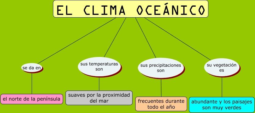 Este Cmap, tiene información relacionada con: El clima oceánico, EL CLIMA OCEÁNICO sus temperaturas son suaves por la proximidad del mar, EL CLIMA OCEÁNICO se da en el norte de la península, EL CLIMA OCEÁNICO sus precipitaciones son frecuentes durante todo el año, EL CLIMA OCEÁNICO su vegetación es abundante y los paisajes son muy verdes